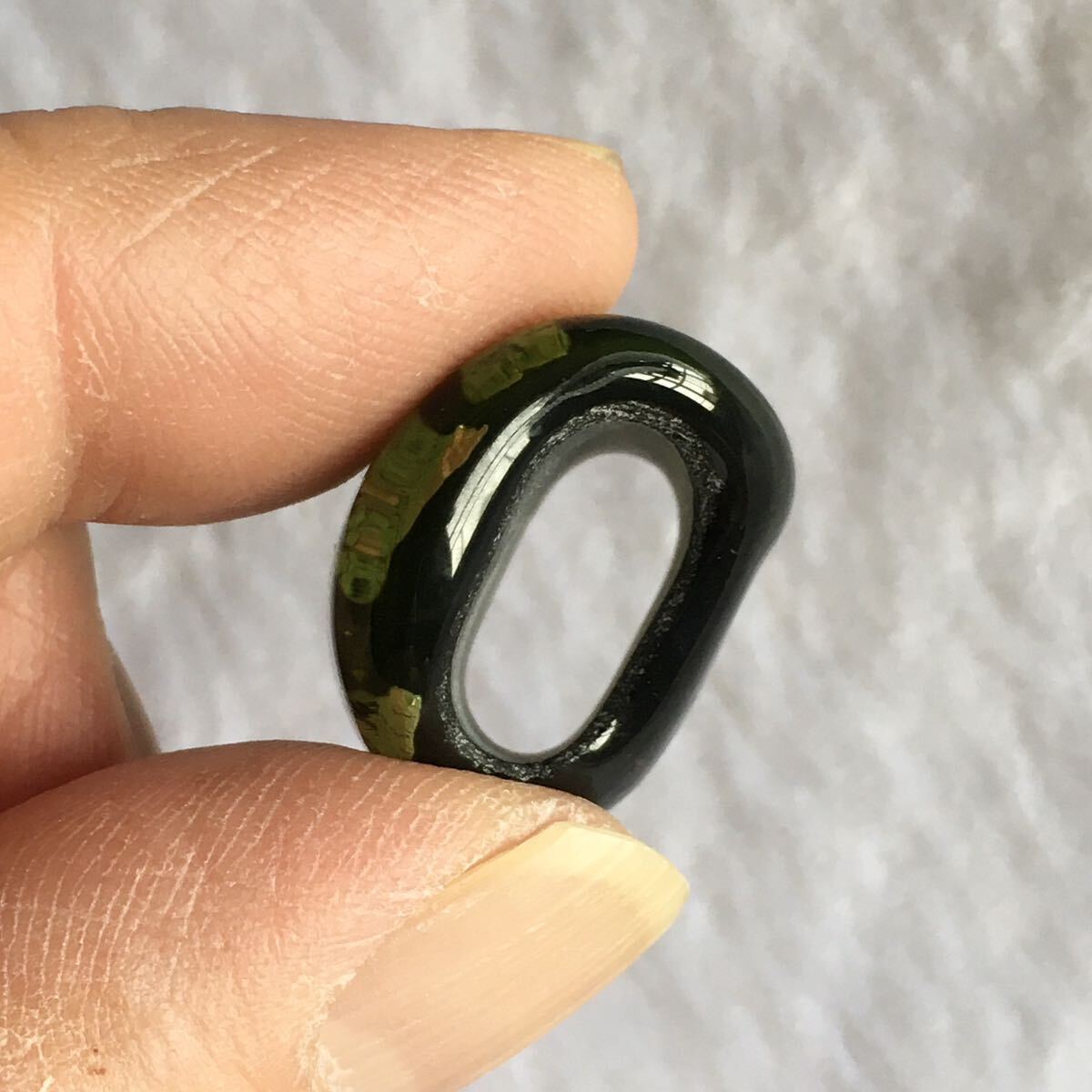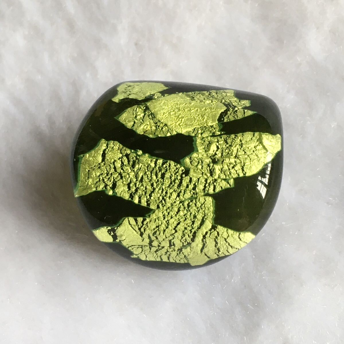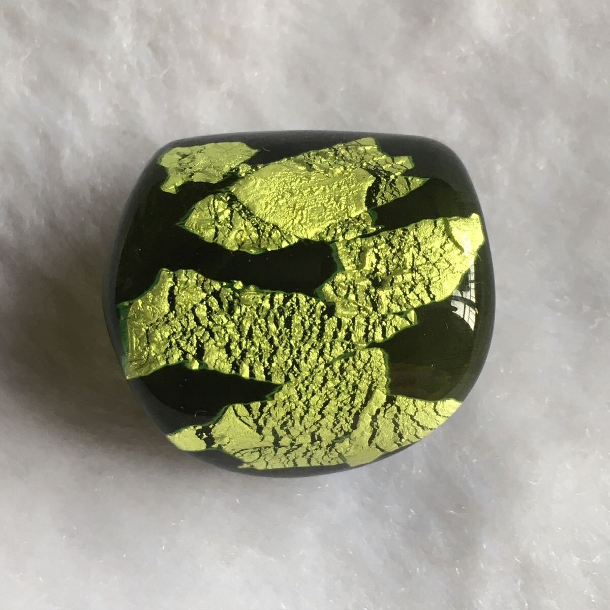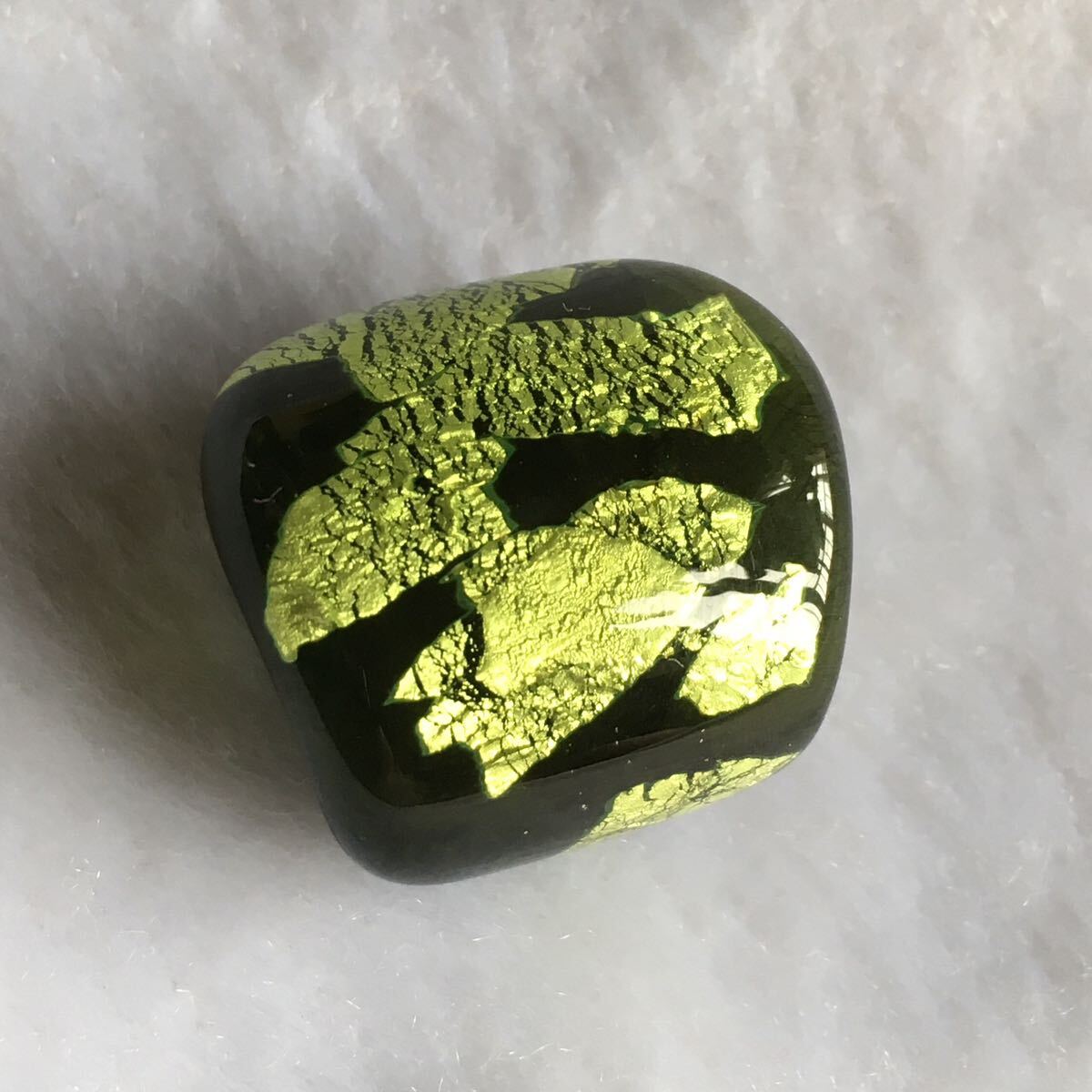 ガラスは二層になっていて、黒いガラスの表面に銀箔を貼り合わせ、その上から黄緑色のガラスを被せています。