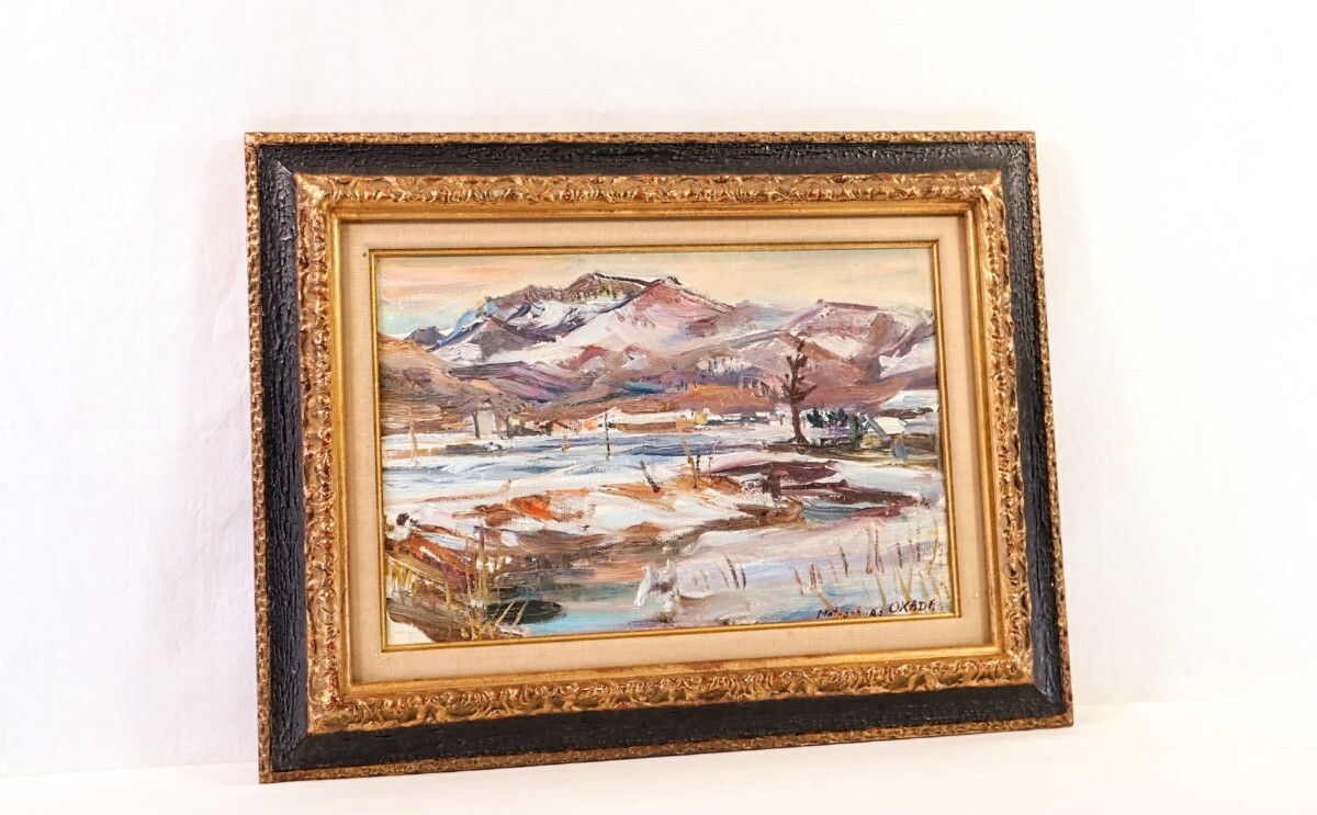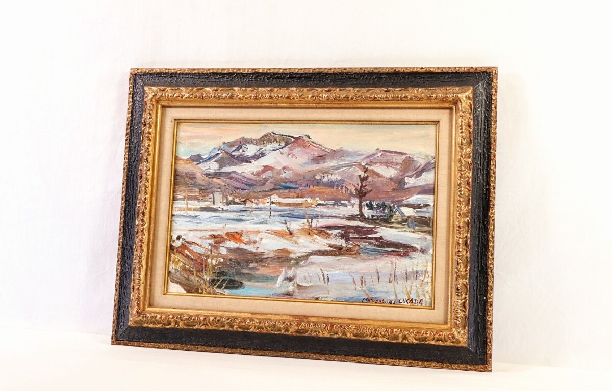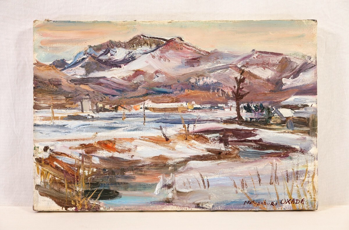 真作 岡田又三郎 油彩「忍野冬日」画寸 P6 東京都出身 日展理事 岡田三郎助 寺内萬治郎に師事 厳格な写実を基本に荒削りで大胆な技法 9061