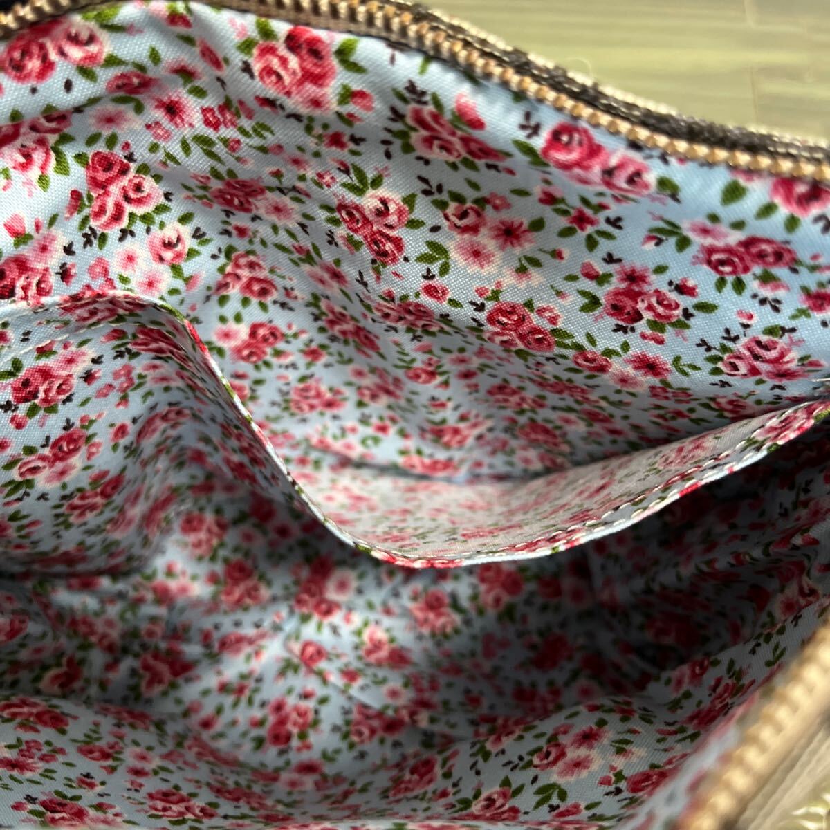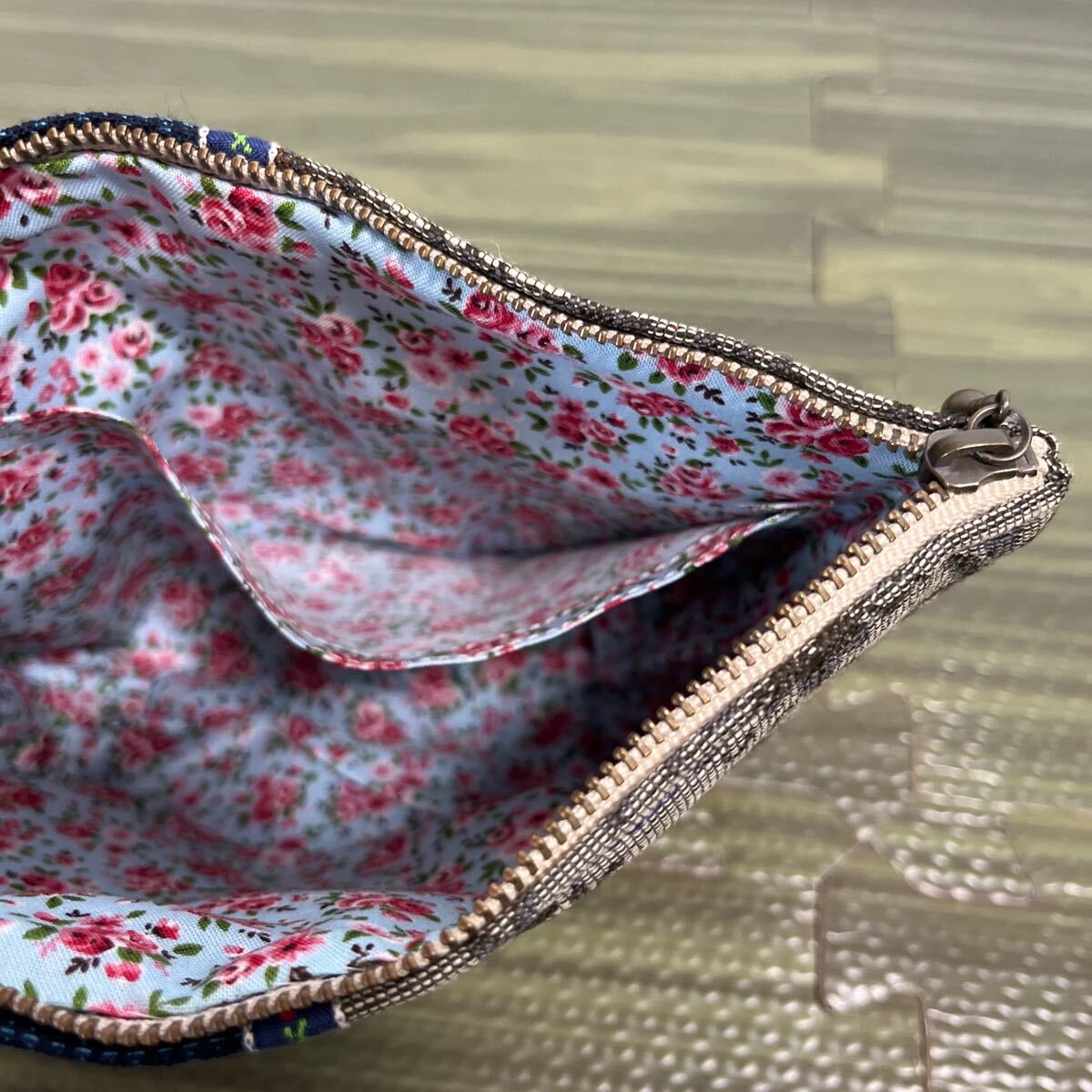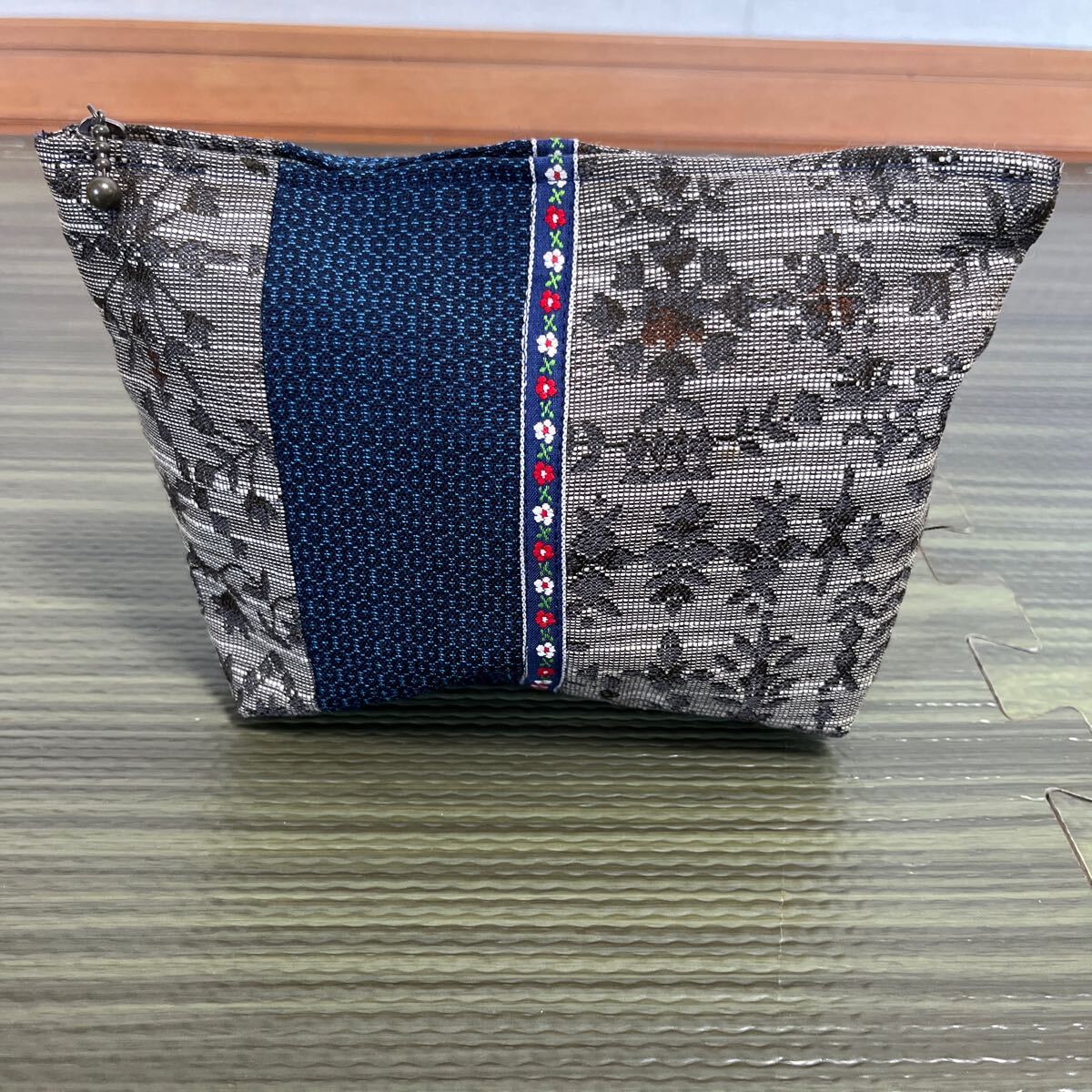 ハンドメイドのリメイクポーチグです。落ち着いた色合いでレトロ感がおゃれだと思います。とてもおしゃれです内側にポケットがついています。新品ですがリメイク商品です。。