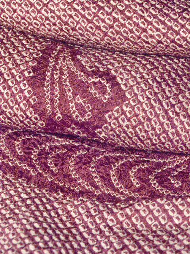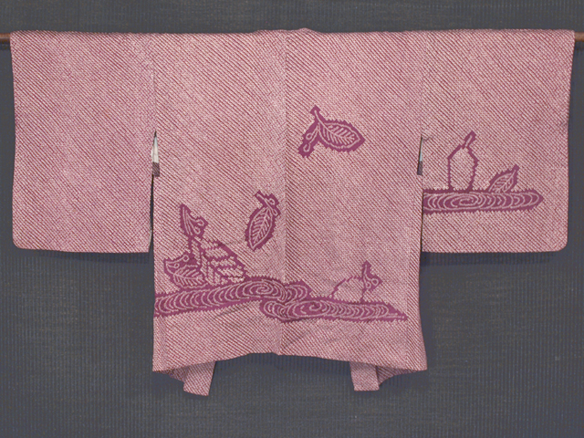 沈んだ濃紅(こいくれない)色の地に、本紋(紗綾形に花)の地紋が織り出され、鹿子(かのこ)の総絞り染めで観世水(かんぜみず)、木の葉と実の文様が施されている、綸子の羽織です。袷仕立てです。 水面(みなも)に舞い落ちる木の葉の情景が装いに深みのあるかわいらしさを与えます。やわらかな手ざわりの綸子地です。 ユーズド品で、羽裏に直径約 1-3cm のごくうっすらとしたうすじみが数か所程度あるほか、左前袖の袖口へりに直径約 3mm のごくうっすらとした黄変が 1 か所ありますが、いずれもあまり判別はつかず、気にはなりません。そのほかに目につく大きなしみやよごれ、褪色などのダメージは見あたらず、全体的には良好な状態です。 |