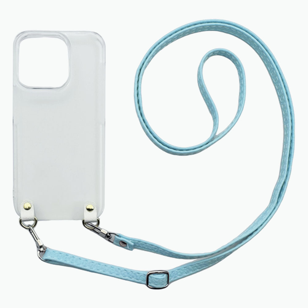 iPhone13 Pro Max(ブルー)ストラップホルダー クリアケース ショルダー くすみカラー 肩掛け 斜めがけ