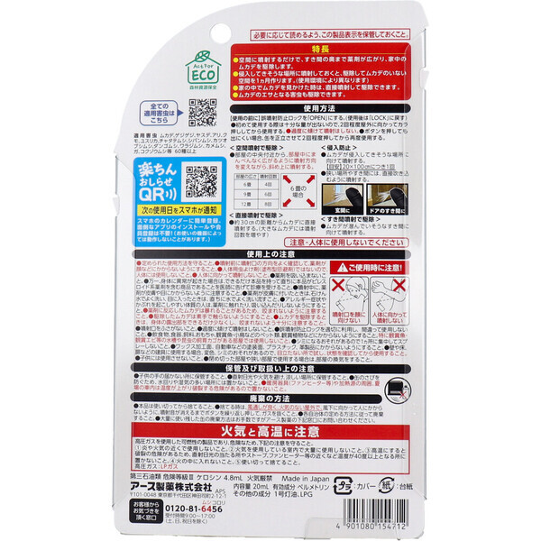 家中使えてまるごと駆除。 通り道に噴射して侵入防止。 空間への噴射や直接噴射して、家にいるムカデを駆除。 通り道に噴射しておけば侵入防止効果(※)が約1ヵ月持続します。 (※残存薬剤による侵入した害虫の駆除効果(使用環境により異なります)) ・家中使えてまるごと駆除。 ・空間に噴射するだけで、すき間の奥まで薬剤が広がり、家中のムカデを駆除します。 ・侵入してきそうな場所に噴射しておくと、駆除してムカデのいない空間を1ヵ月作ります。 (使用環境により異なります) ・家の中でムカデを見かけた時は、直接噴射して駆除できます。 ・ムカデのエサとなる害虫も駆除できます。 ・汚れ・ベタつきなし。 ・無香料。 ・赤ちゃん・ペットがいるご家庭にも。 個装サイズ:123X214X38mm 個装重量:約70g 内容量:20mL 製造国:日本 【発売元:アース製薬株式会社】 【対象害虫】 ムカデ、ゲジゲジ、ヤスデ、アリ、クモ、ユスリカ、チャタテムシ、シバンムシ、 カツオブシムシ、ダンゴムシ、ワラジムシ、カメムシ、ガ、コクゾウムシ等60種以上 【成分】 ★有効成分:ペルメトリン ★その他の成分:1号灯油、LPG 【使用方法】 ★使用の前に ・誤噴射防止ロックを「OPEN」にする。 (使用後は「LOCK」に戻す。) ・初めて使用する際は十分な量が出ないので、2回程度屋外に向かってカラ押ししてから使用する。 ・過度に傾けて噴射はしない。 ・ボタンを押しても出にくい場合、缶を正立させて2回程度押してから再度使用する。 ★空間噴射で駆除 ・部屋の中央付近から、部屋中にまんべんなく広がるように噴射方向を変えながら、斜め上に噴射する。 ★直接噴射で駆除 ・約30センチの距離からムカデに直接噴射する。 (大きなムカデには噴射回数を増やす) ★侵入防止 ・ムカデが侵入してきそうな場所に向けて噴射する。 (目安20×100センチにつき1回) ・狭い場所やすき間には、直接吹き込むように噴射する。 ★すき間噴射で駆除 ・ムカデが潜んでいそうなすき間に向けて噴射する。 【使用上の注意】 ・人体に使用しない。 ・定められた使用方法を守ること。 ・噴射前に噴射口の方向をよく確認して、薬剤が顔などにかからないようにすること。 ・人体用虫よけ剤(塗布型忌避剤)ではないので、人体には使用しないこと。 ・人体に向かって噴射しないこと。 ・薬剤を吸い込まないこと。 ・万一、身体に異常が起きた場合は、できるだけ本品を持って直ちに本品がピレスロイド系薬剤を含む商品であることを医師に告げて診療を受けること。 ・噴射中に、薬剤が皮膚や目にかからないように注意すること。 ・薬剤が皮膚に付いたときは、石けん水でよく洗い、目に入ったときは、直ちに水でよく洗い流すこと。 ・アレルギー症状やかぶれを起こしやすい体質の人は、薬剤に触れたり、吸い込んだりしないようにすること。 ・薬剤に反応したムカデは暴れることがあるため、咬まれないように注意すること。 ・駆除したムカデは素手で触らないようにすること。 ・ムカデを駆除するときは、身体の露出部をできるだけ少なくし、咬まれないよう十分に注意すること。 ・噴射口をふさがないこと。 注意事項 ※予告なく成分・パッケージが変更になることがございます。 予めご了承ください。 *予告なく成分・パッケージが変更になることがございます。予めご了承ください *ダンボールを使用して発送する場合には、入数以下の個数の場合、 中古ダンボールを使用する場合があり、ご注文の商品とは異なるダンボールになる場合があります。 あらかじめ、ご了承ください。 |