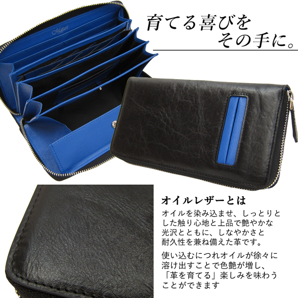 Maturi マトゥーリ オイルレザー 牛革 コインスルー 縦型カード入れ 長財布 ラウンドファスナー MR-072 BK/BL 新品