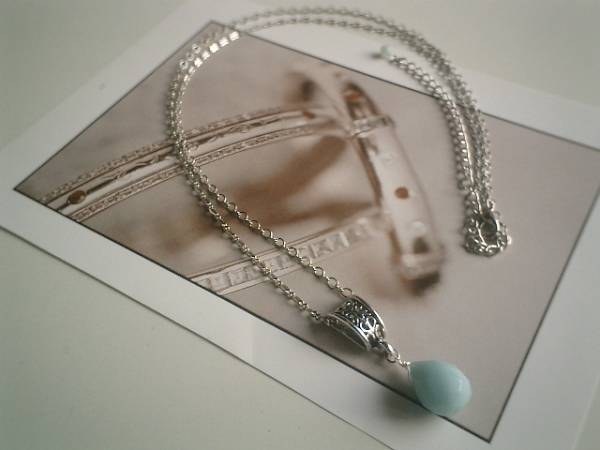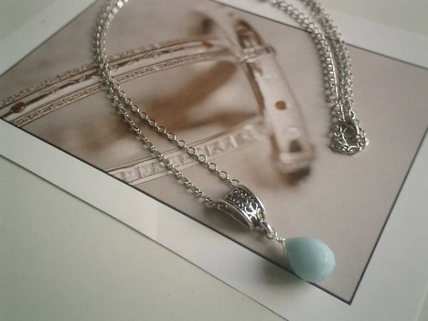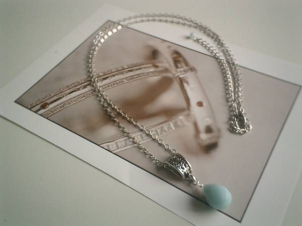 仏蘭西物語・・シリーズです♪ミッシェルの水色・・可憐なアマゾナイトのネックレスです♪華奢なチェーンにアマゾナイトのドロップを合わせて儚げな表情です♪トップは外せますのでシンプルにも楽しんでいただけます♪華奢なチェーンに18×13ミリのドロップカットのアマゾナイトを合わせました♪シックな座金を合わせてロマンチックな表情です♪長さは66センチ+アジャスター13センチで最長79センチ位です♪お揃いのネックレスやブレスレットも出品しています♪♪シンプルで飽きのこないいつまでも着けられるデザインを考えて作りました!ハンドメイドをご理解頂いてノークレーム、ノーリターンでお願いします