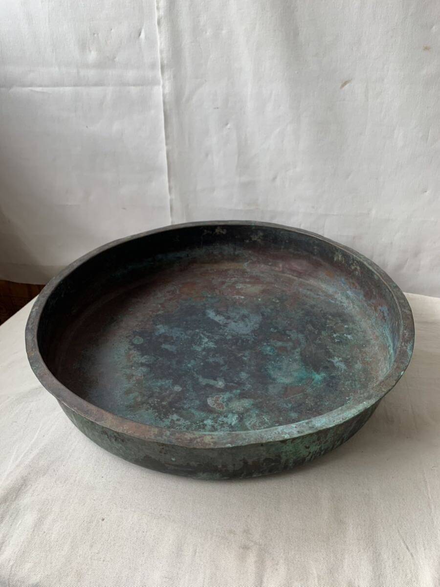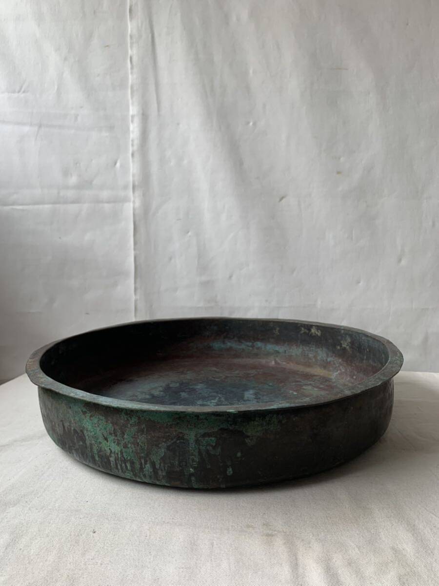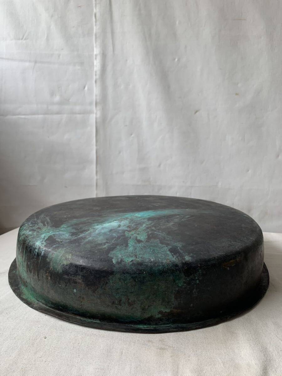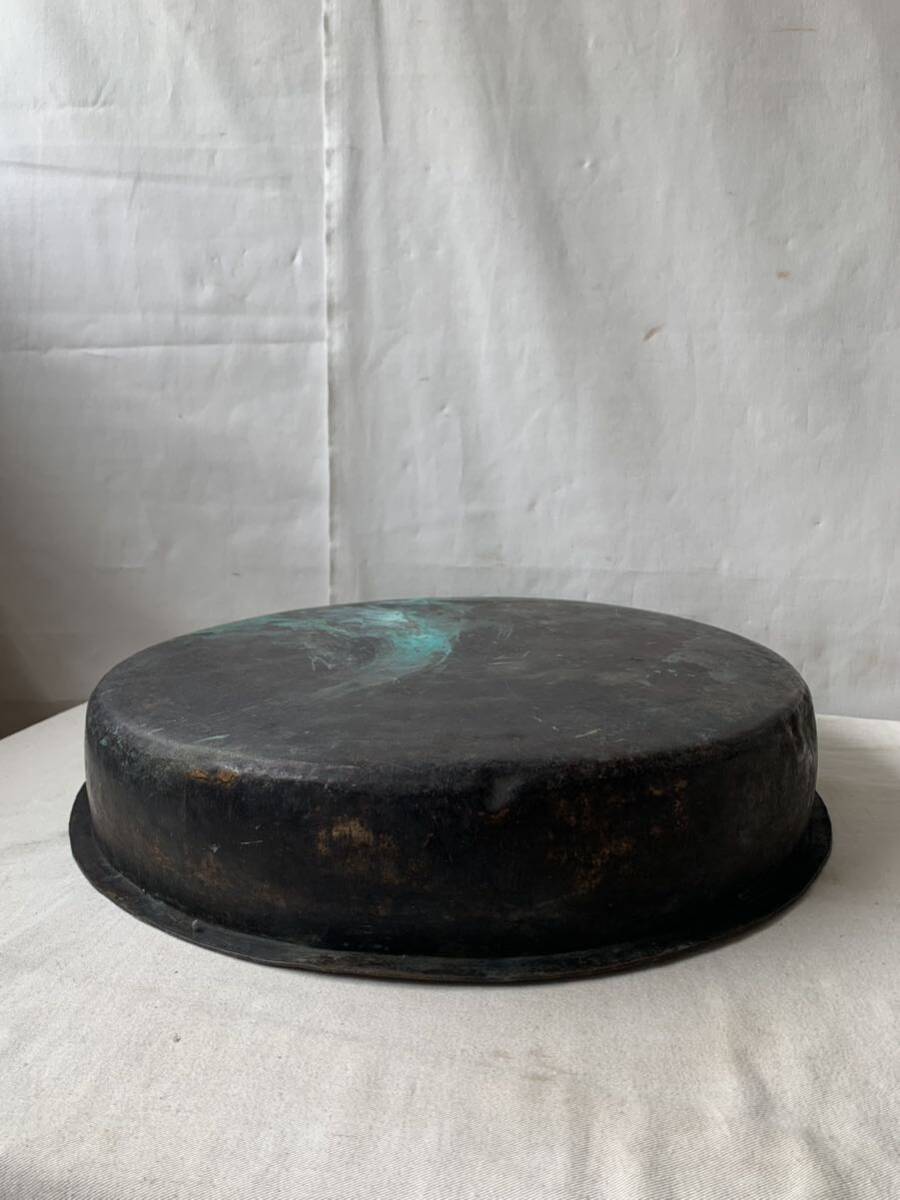 旧家蔵出し品 経年の雰囲気が素敵な大きな銅製円形ケースです。ずっしりと重いです。オブジェとして飾ったり、布やスリッパ、小物などを入れて、お部屋のインテリアやお店のディスプレイ、イベント出店時の什器などに使って頂くと素敵だと思います。