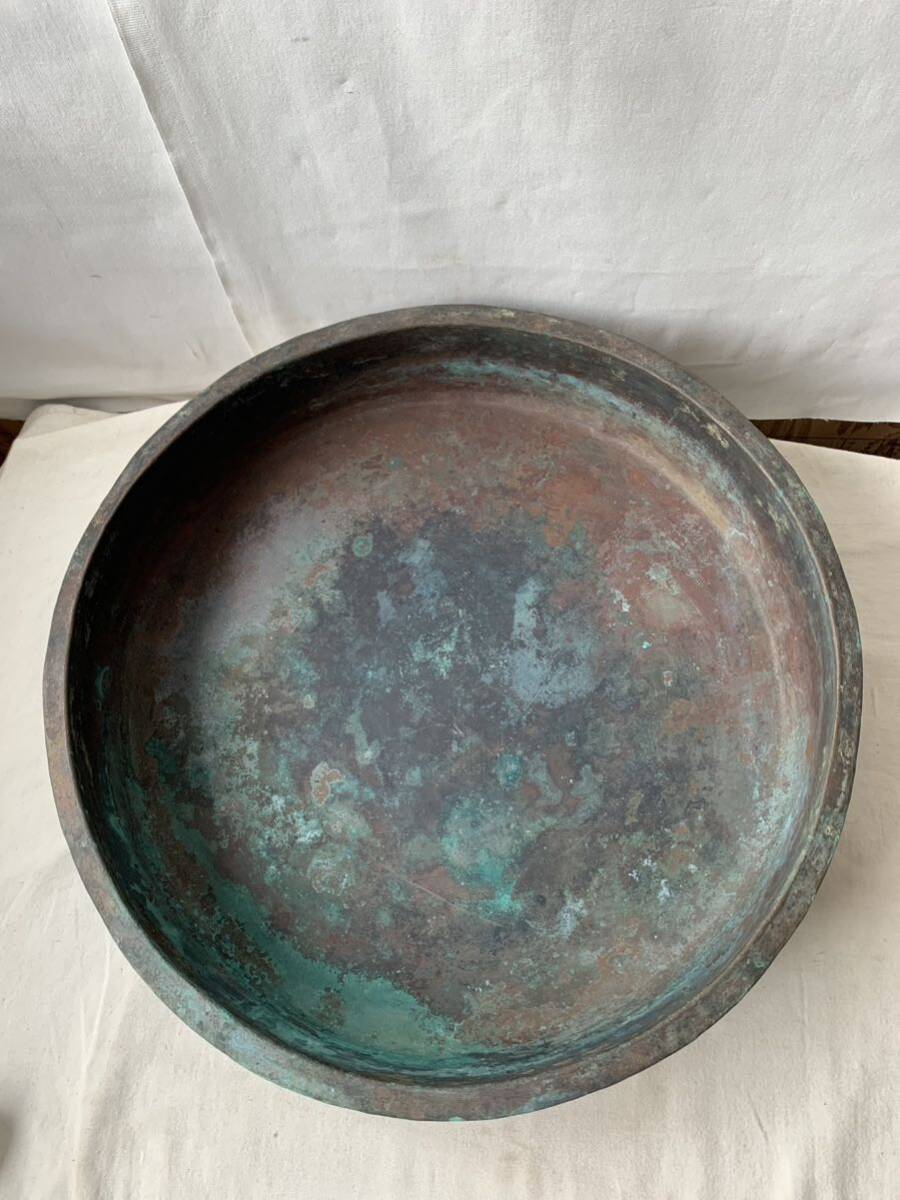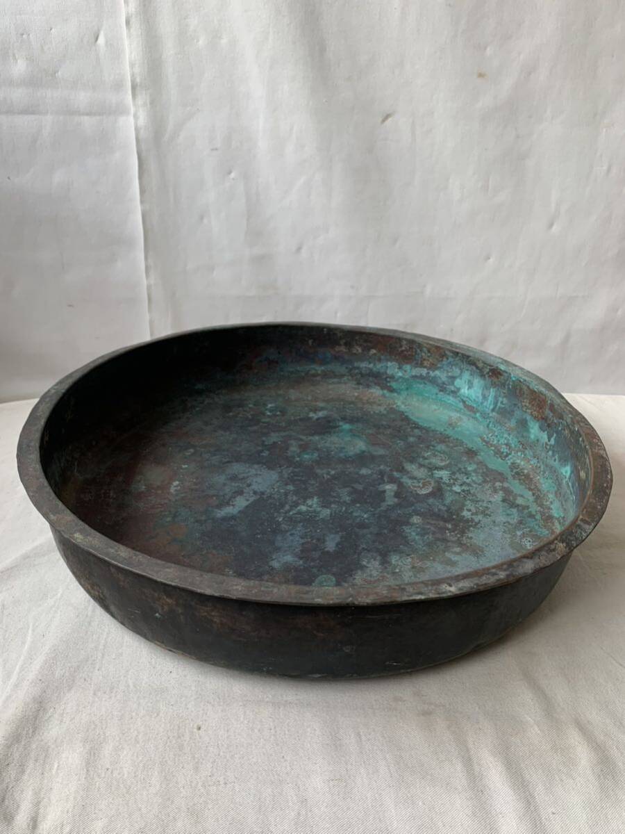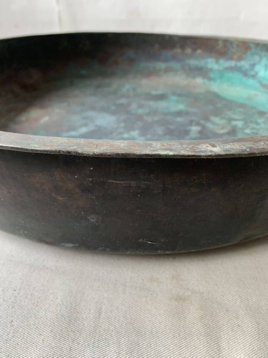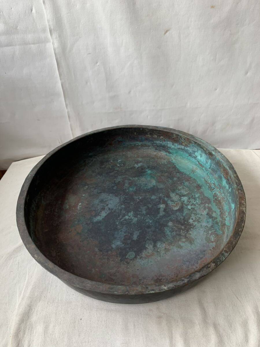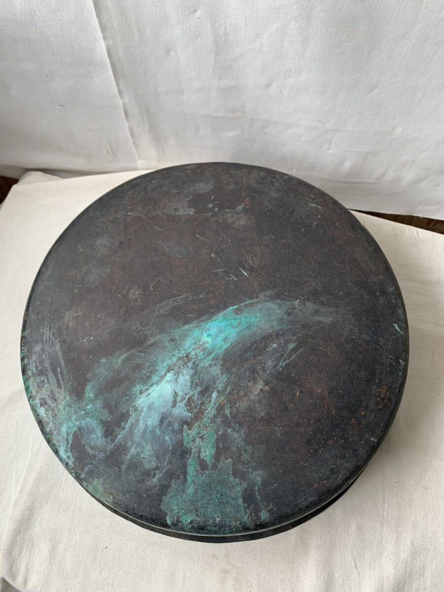 旧家蔵出し品 経年の雰囲気が素敵な大きな銅製円形ケースです。ずっしりと重いです。オブジェとして飾ったり、布やスリッパ、小物などを入れて、お部屋のインテリアやお店のディスプレイ、イベント出店時の什器などに使って頂くと素敵だと思います。
