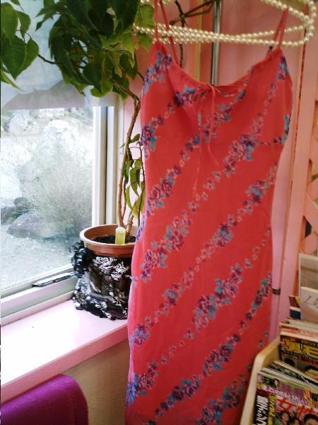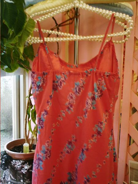 肩ひもにかけてバストライン絞りひもリボン付きで調節可能で裏地付きでシフォンタイプの斜めお花柄ロングワンピーでとてもきれいなラインです。ボレロ・カーディなど羽織っていただけると良いと思います。生地:ポリエステル100% サイズ:9 バスト83 ヒップ91 お色:ピンク・ブルー・紫 着丈74 未使用で自宅保管ありです。