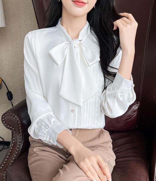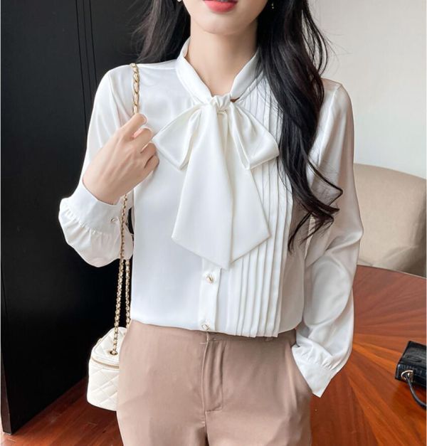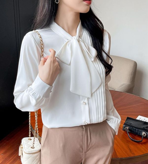 春新品 /優雅で ボウタイ リボン ブラウス シフォン 上品 きれいめ 長袖シャツ オフィス 大きいサイズ 通勤仕事 お呼ばれ トップス /M-3XL