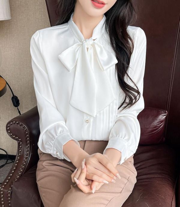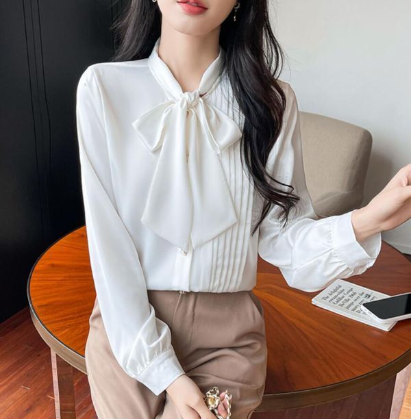 春新品 /優雅で ボウタイ リボン ブラウス シフォン 上品 きれいめ 長袖シャツ オフィス 大きいサイズ 通勤仕事 お呼ばれ トップス /M-3XL