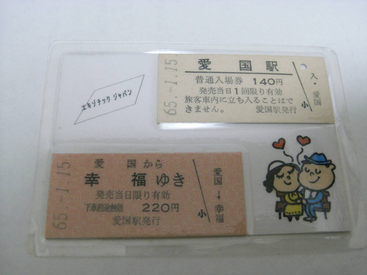 画像の1点です。 「愛国駅 普通入場券」 硬券入場券と「愛国から幸福ゆき」 硬券乗車券がパウチ加工されております。