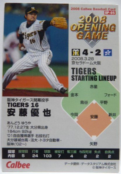 カルビープロ野球カード2008年 開幕投手 OP-05【安藤 優也(阪神タイガース)】平成20年チップスおまけ食玩トレーディングカード(中古)送料込