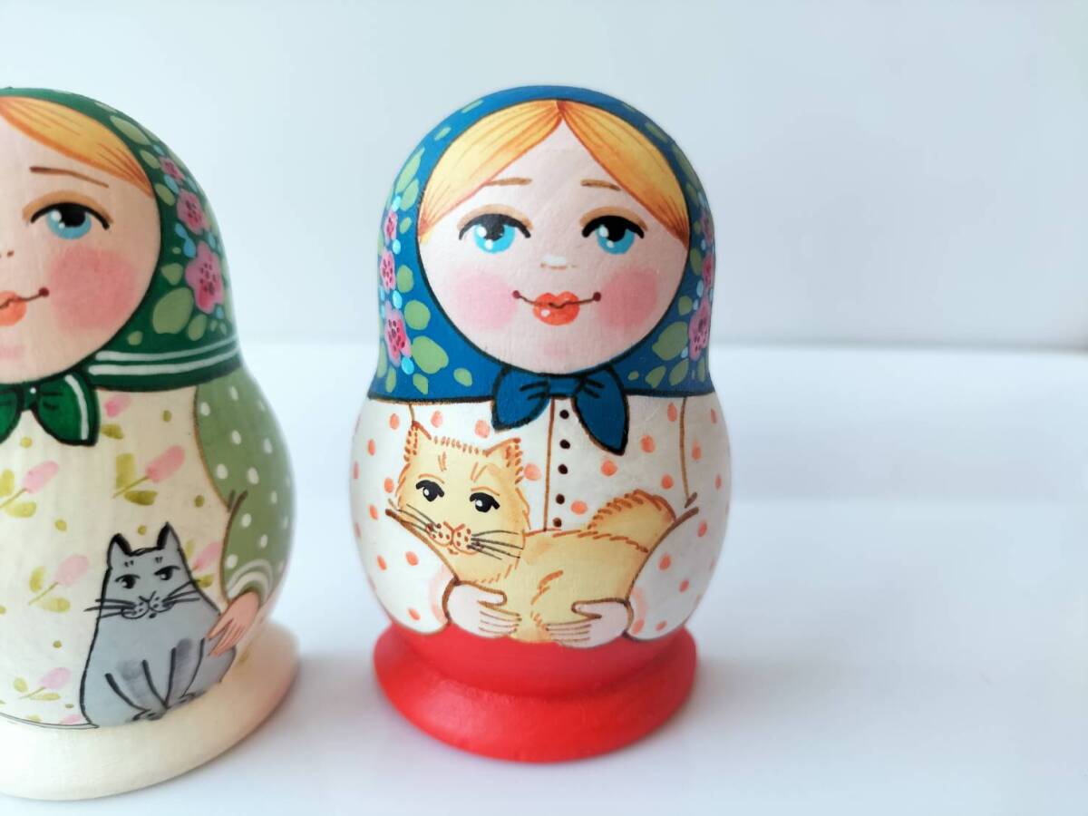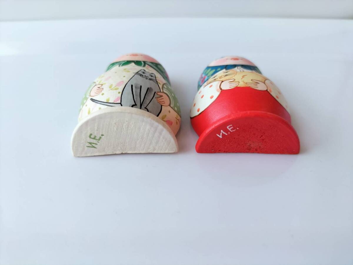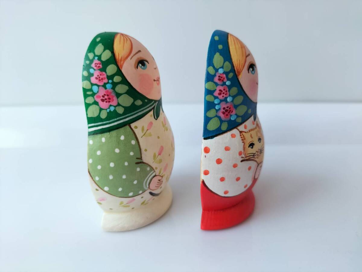 彼女の描くマトリョーシカや起き上がりこぼしは、可愛らしい顔が特徴的です。パステルカラーな色彩は誰もが持つメルヘンチックな淡い童心を思い起こさせます。