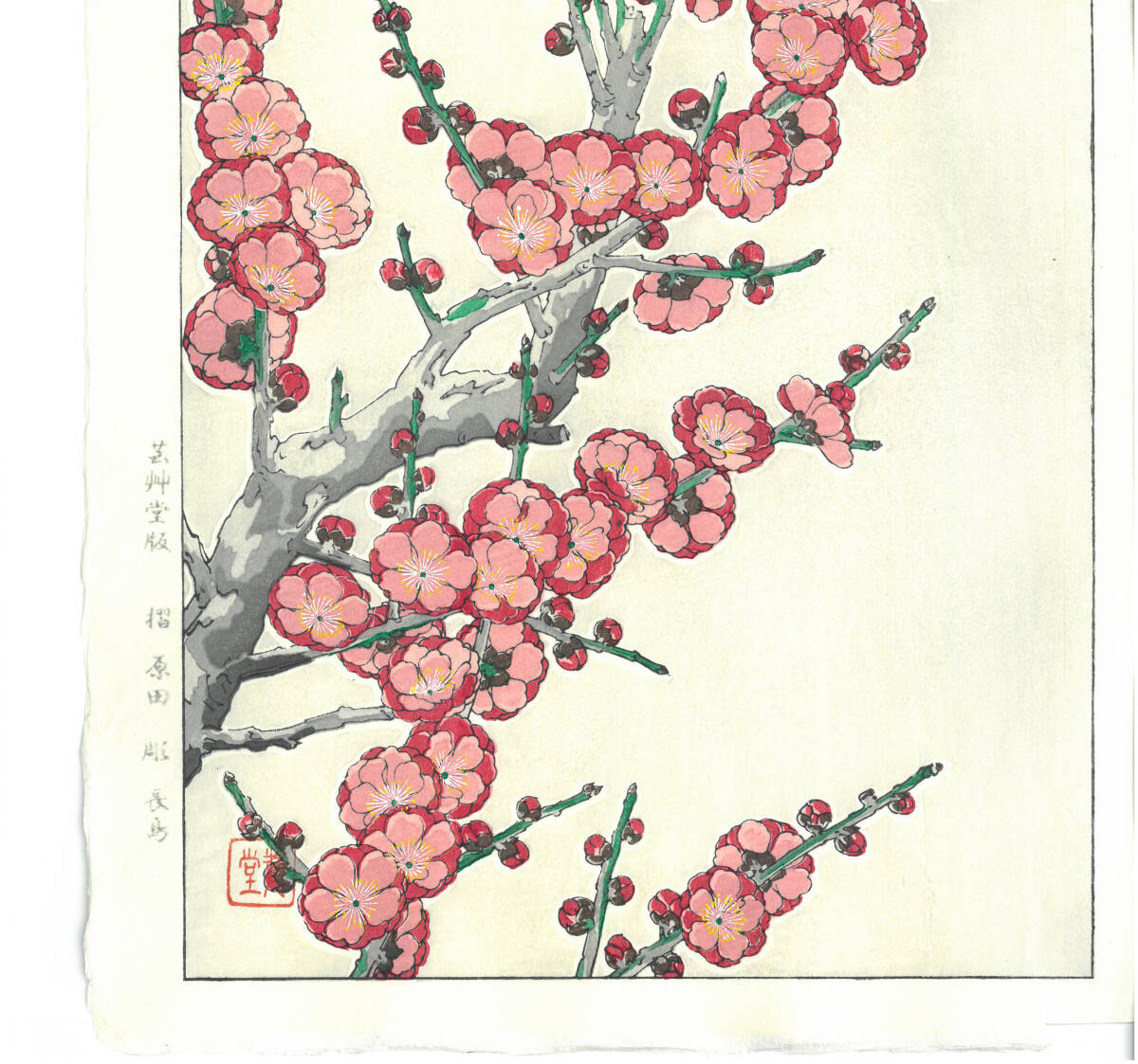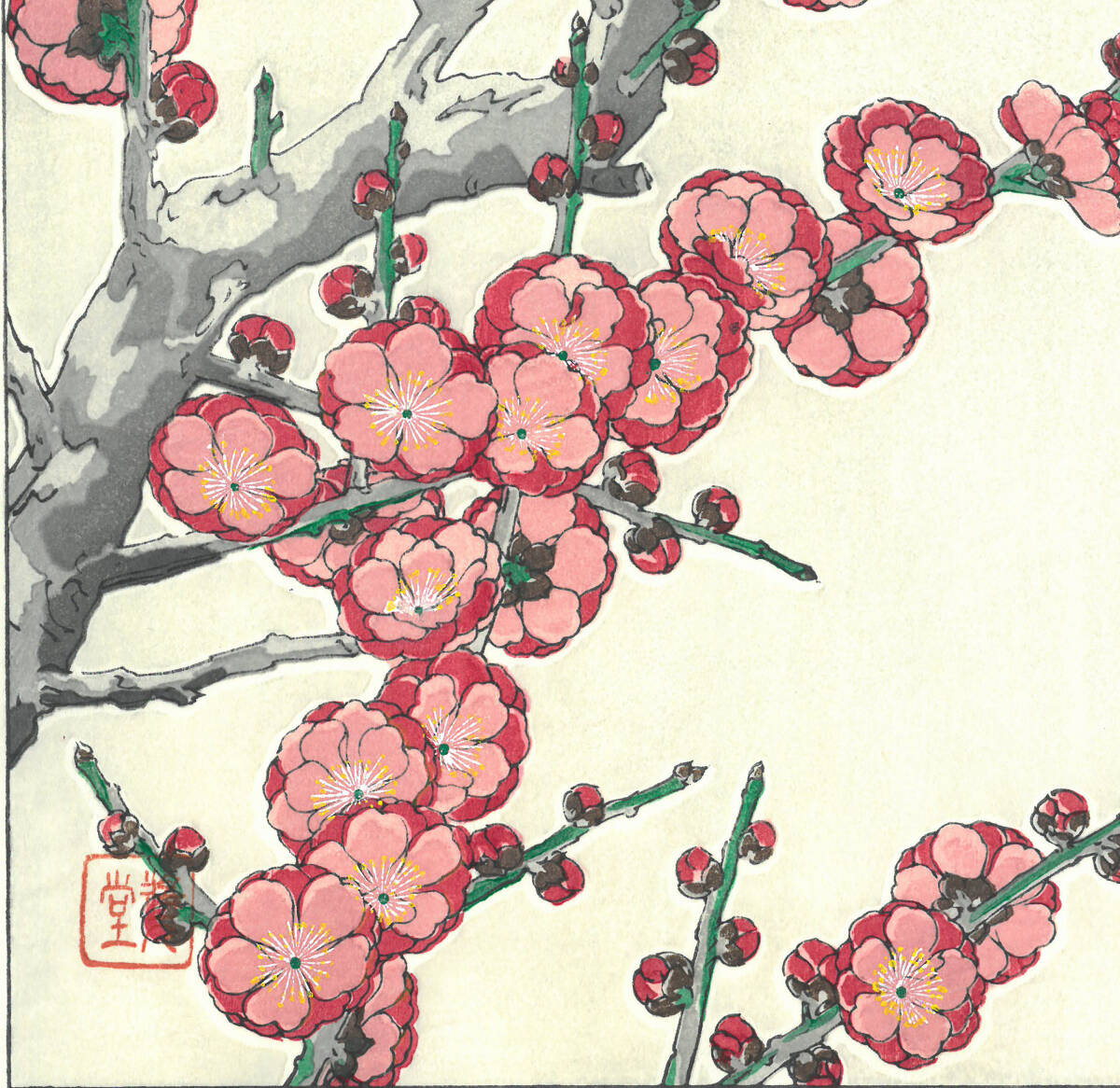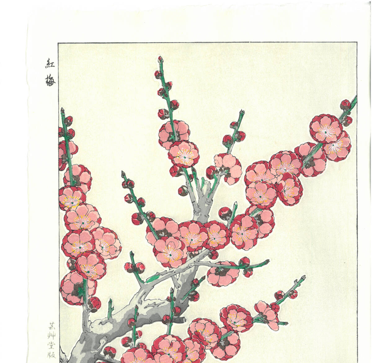 真作保証 河原崎奨堂 木版画  #22 紅梅 Plum 花版画  初版昭和中期~ 京都らしい花版画の美をご自宅でお楽しみください。
