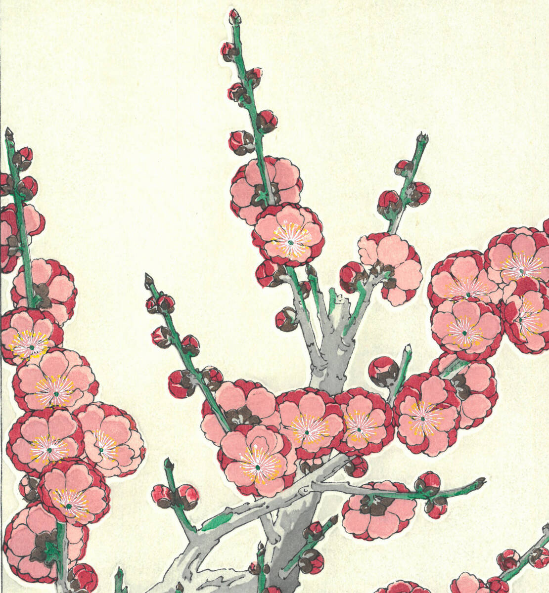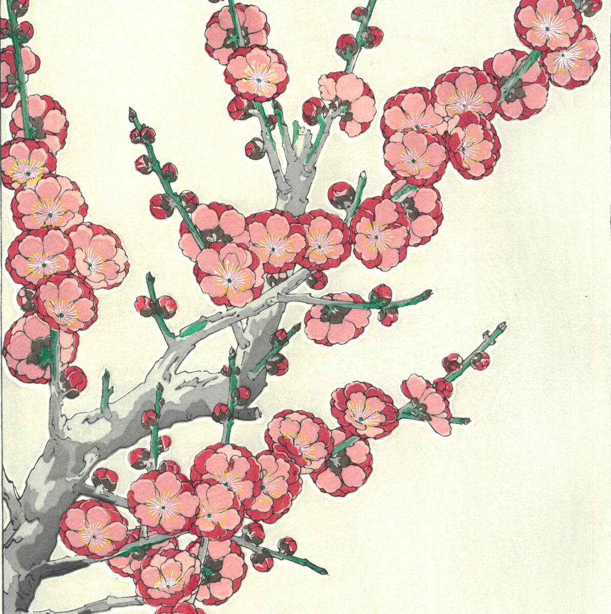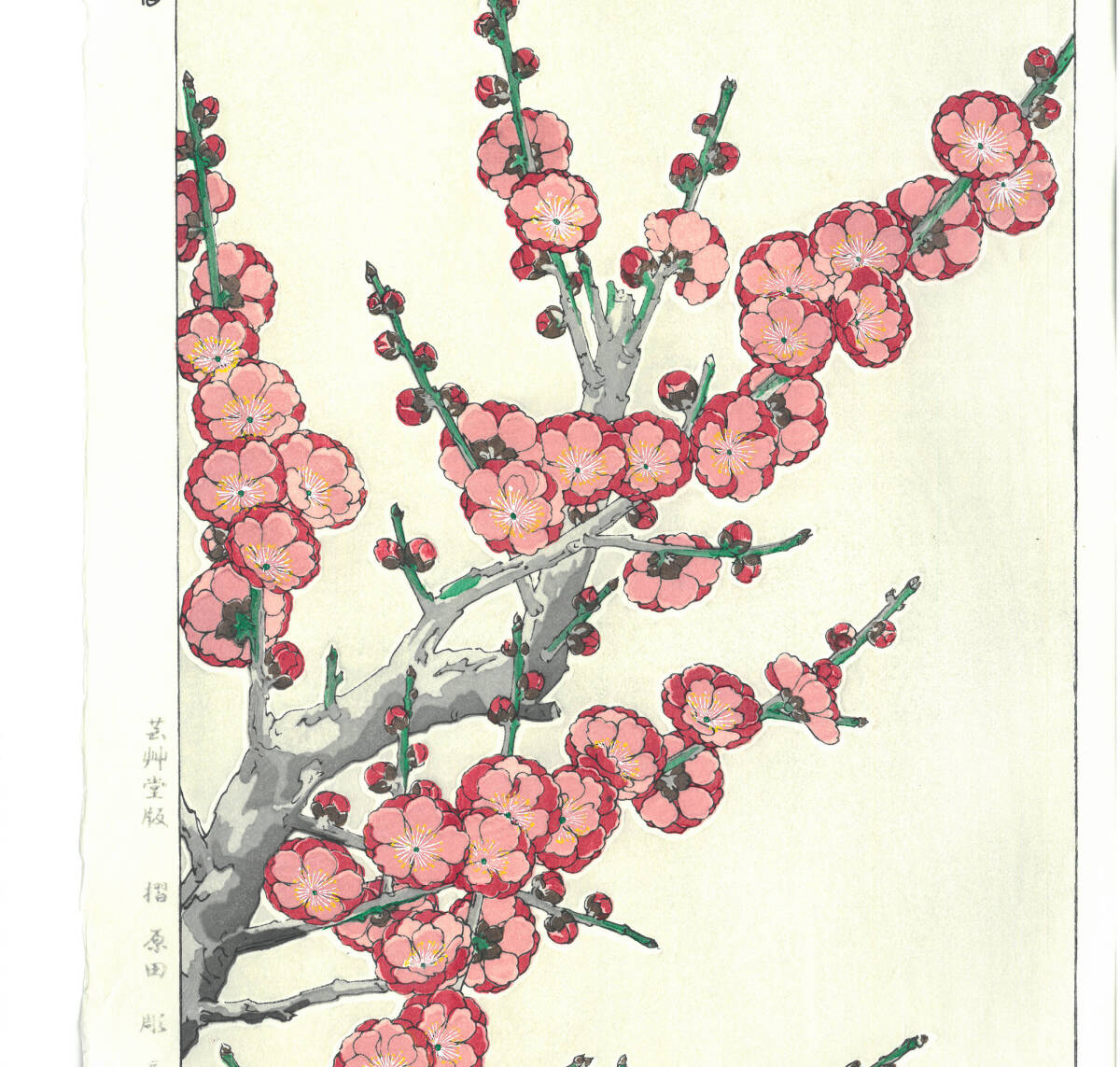 真作保証 河原崎奨堂 木版画  #22 紅梅 Plum 花版画  初版昭和中期~ 京都らしい花版画の美をご自宅でお楽しみください。
