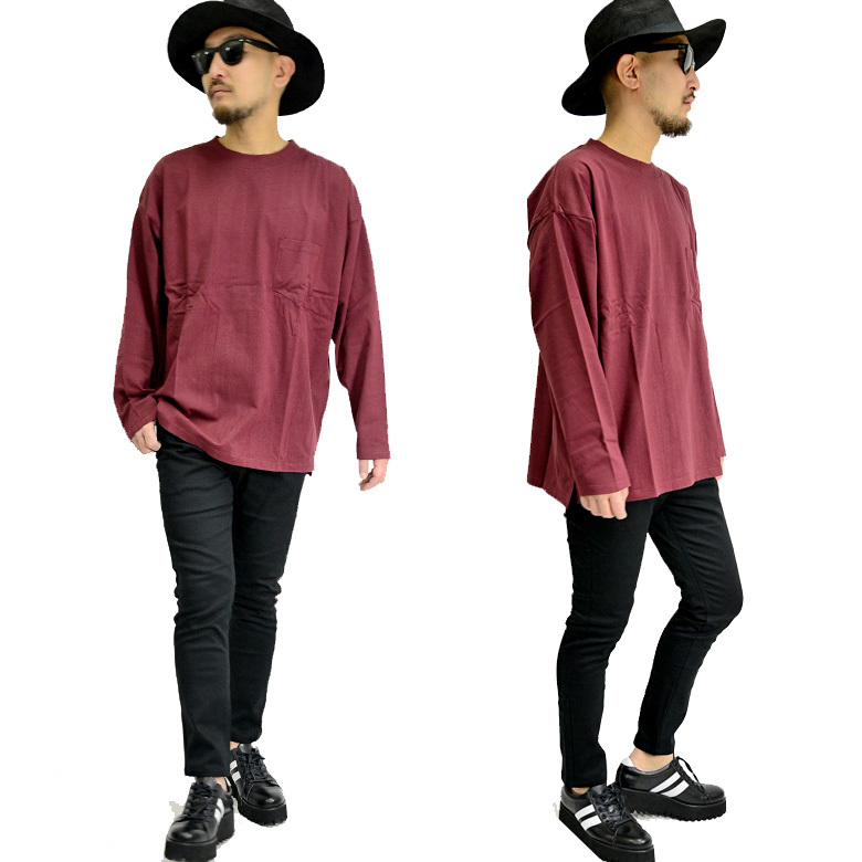 ビッグシルエット ポケット付き 長袖Tシャツ ヘビーウエイト メンズロンT 50542 新品ワイン L