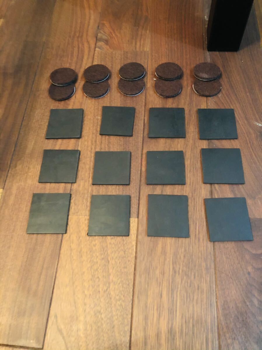 天板と脚の間(脚の上部)に付属品の滑り止め黒ゴムを挟んで、天板の重みで安定させます。