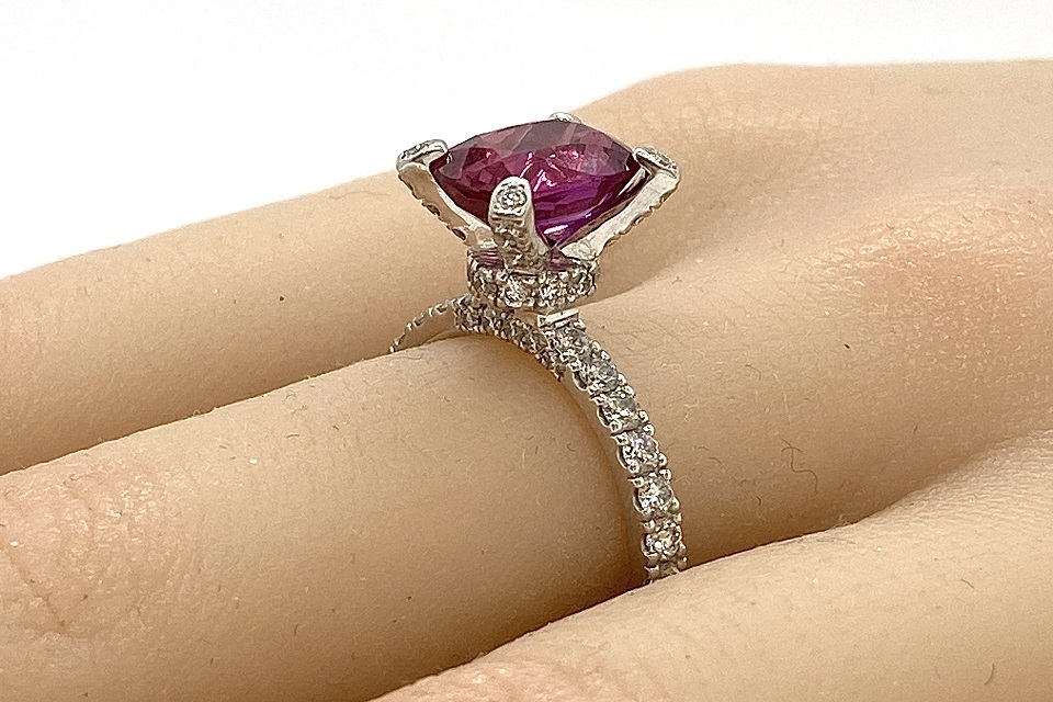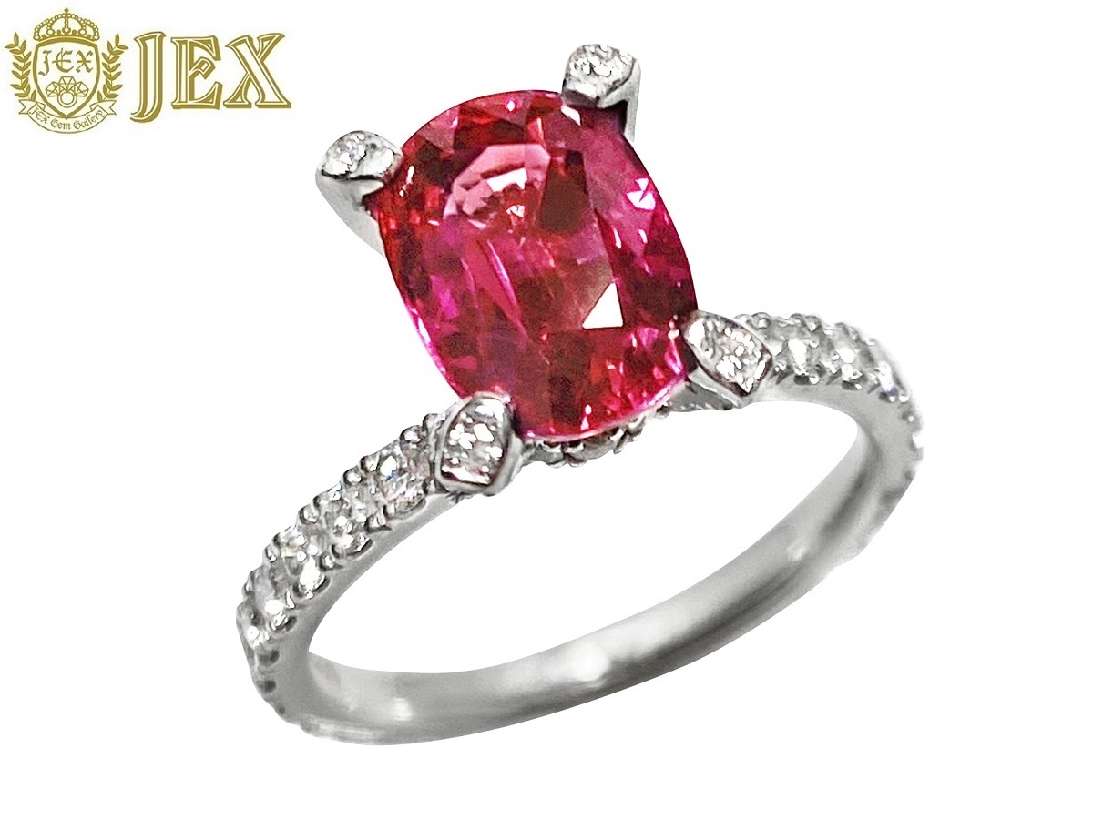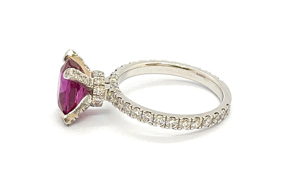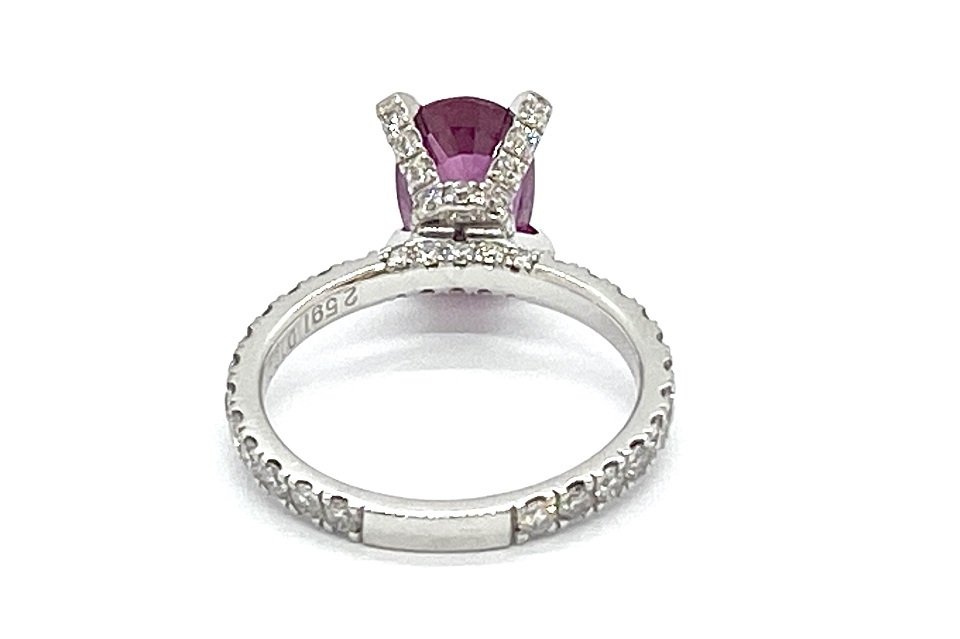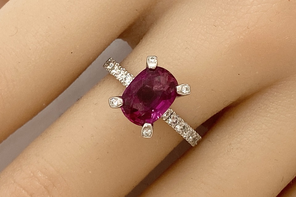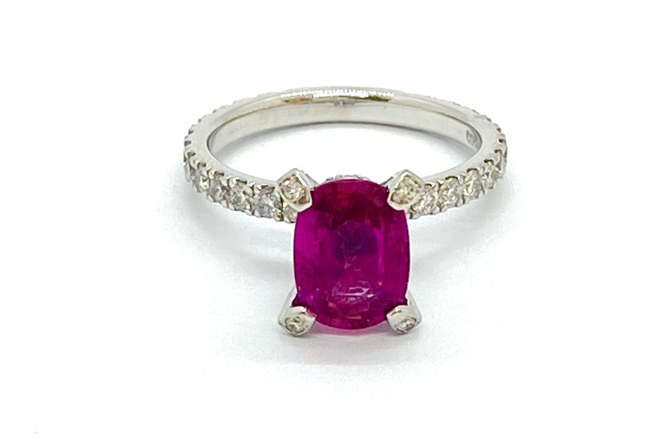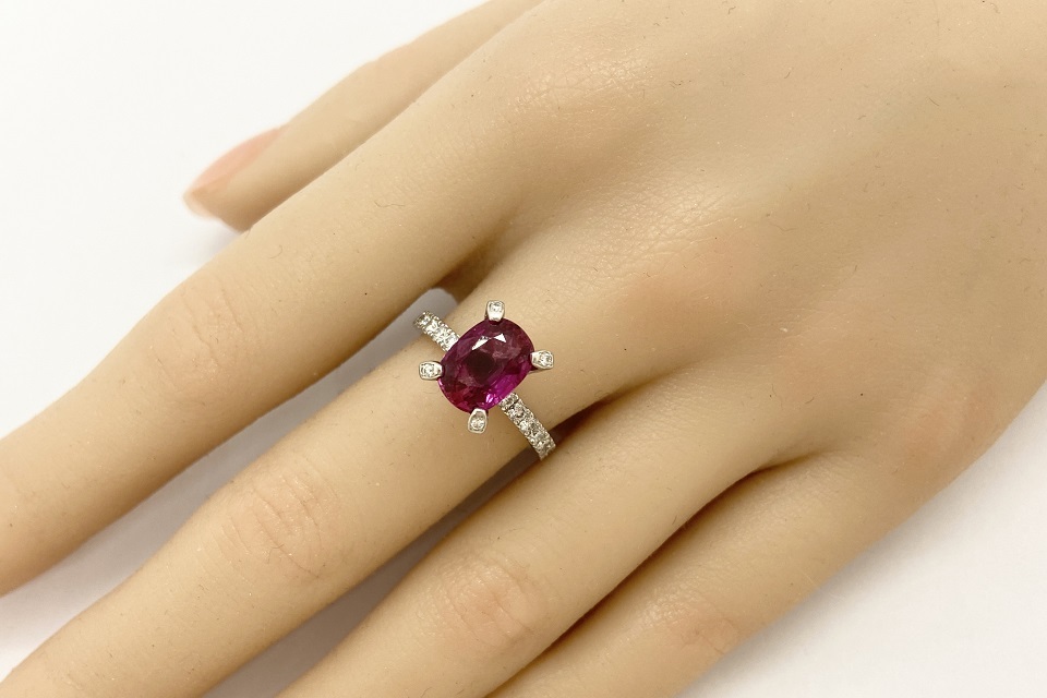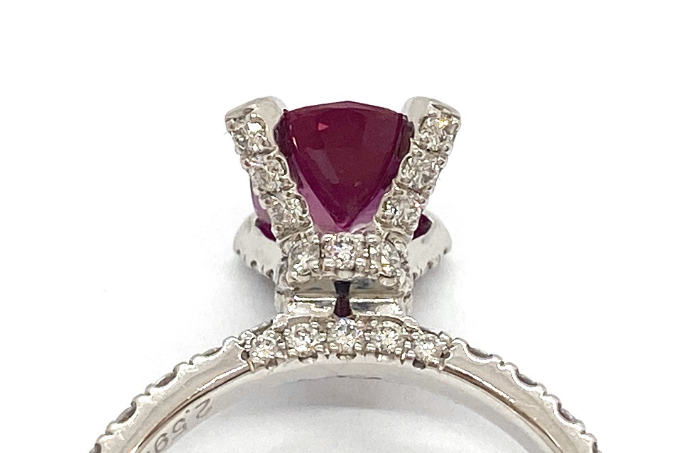 解説 | ピンキッシュですが、2.5ctUPでこれは破格!繊細なリングから主役を高く掲げ、爪にまでダイヤをセットした特別な仕立てが、凛と華やかなルビーの個性を際立てています。 |