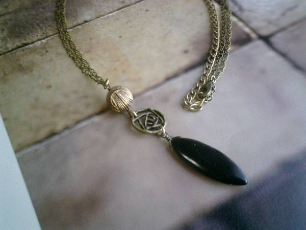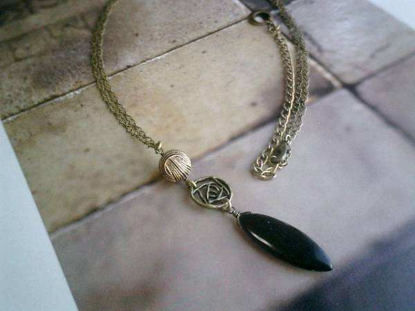 コゼットの裁縫箱・・シリーズです♪シックな黒とベージュ・・キュートなオニキスのネックレスです♪漆黒のオニキスがアンティーク・モダンな表情です♪華奢なチェーンに合わせたオニキスは32×12ミリ位のマーキスです♪薔薇の透かしチャームやアンティークビーズを合わせてキュートです♪長さは82センチ位で調節自由です♪お揃いのネックレスやブレスレットやイヤリングも出品しています♪シンプルで飽きのこないいつまでも着けられるデザインを考えて作りました!ハンドメイドをご理解頂いてノークレーム、ノーリターンでお願いします
