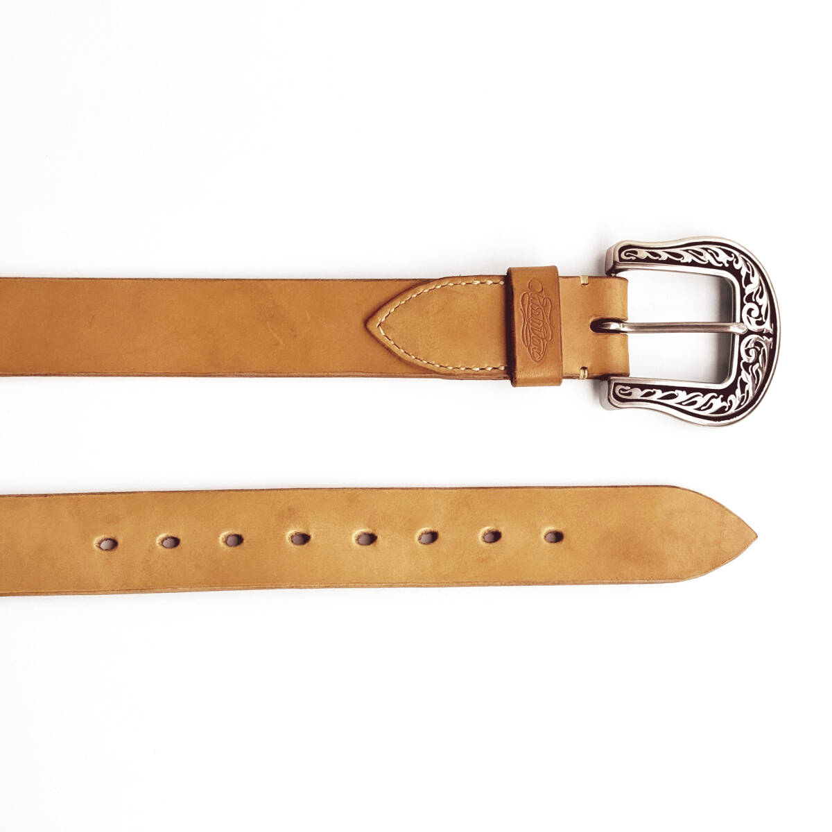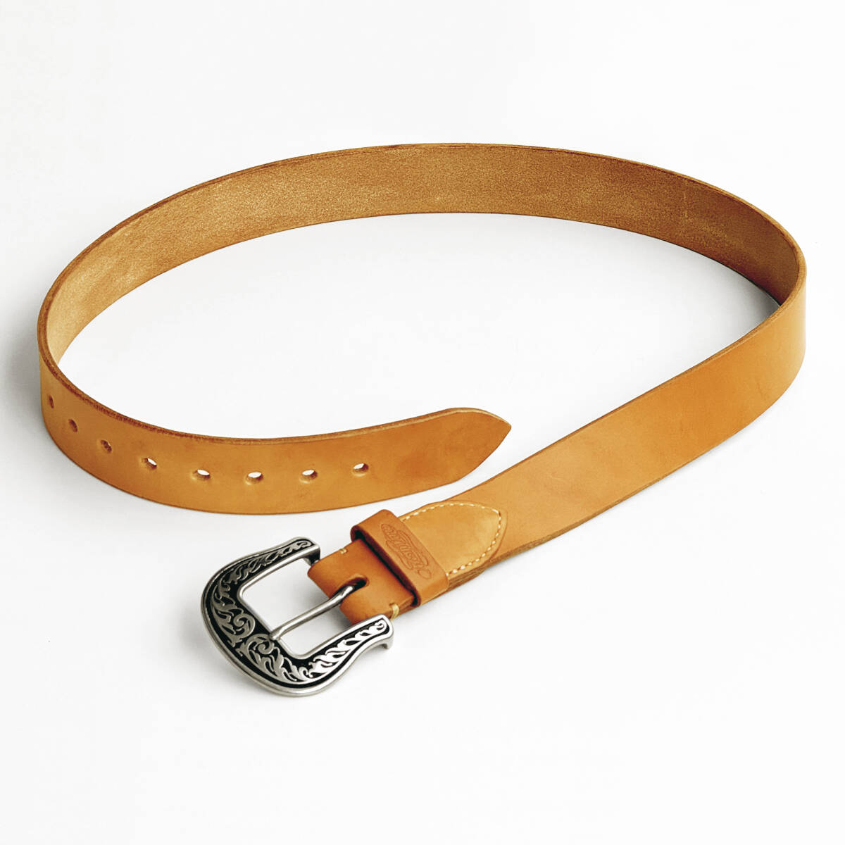 フローラル柄バックルに、ヌメ革(ナチュラル色)の革を使用した、日本製牛革ベルトです。