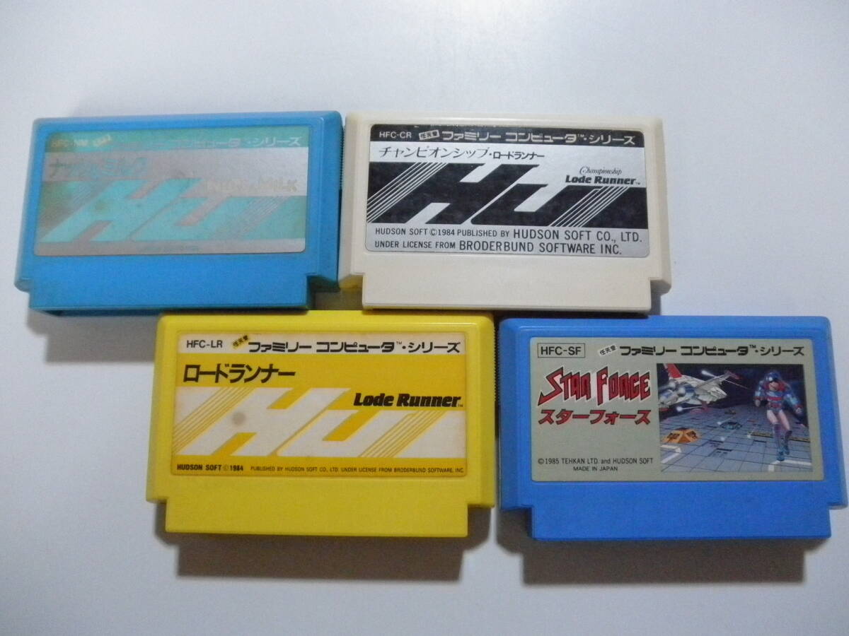 ●FCソフトセット ハドソン裏シール青文字4本(ナッツ&ミルク、ロードランナー2種、スターフォース) 初期起動確認済
