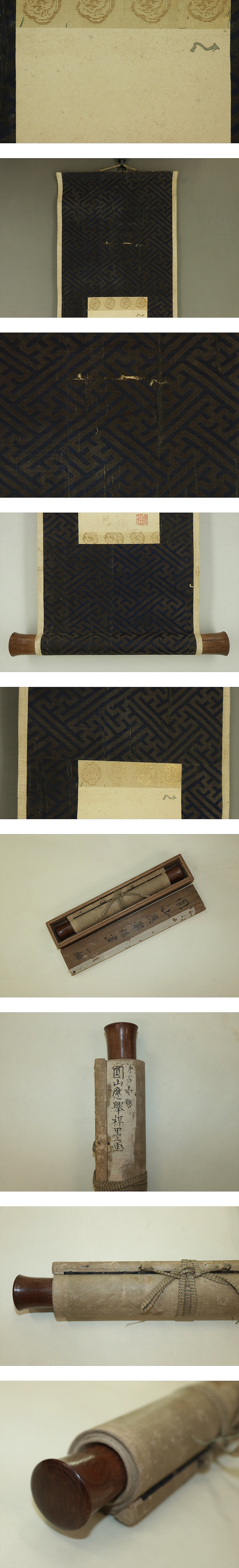 円山応挙 まるやま-おうきょ(1733-1795) 江戸後期の画家。円山派の祖。丹波生。 字は僊斎・仲選、号は一嘯・夏雲・仙嶺等、通称は主水。 石田幽汀に狩野派の画法を学び、幽汀の写生的画法に、宋・元画の技法を取り入れると共に、 西洋画の遠近法を研究して一家を成した。動植物の写生を最も能くする。 寛政7年(1795)歿、63才。 本紙は、染み、汚れ、折れ、皺、虫食があります。 表装は、染み、汚れ、折れ、皺、虫食、破れ、ほつれ、剥れ、修復痕、箱に虫食いがあります。 【サイズ】 作品 横約12cm×縦約126cm 表装 横約24cm×縦約172cm |