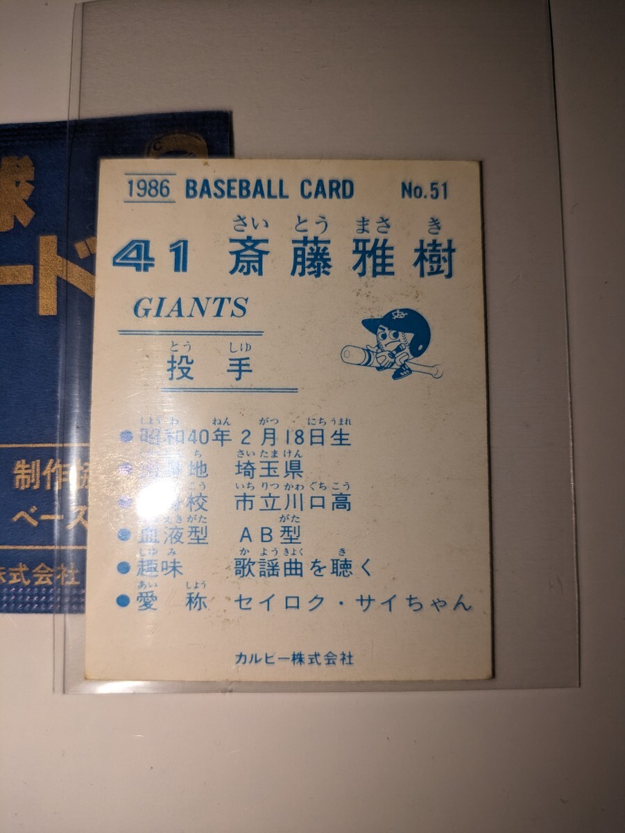 斎藤雅樹 86 カルビープロ野球チップス No.51 RC 読売ジャイアンツ