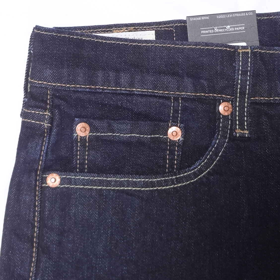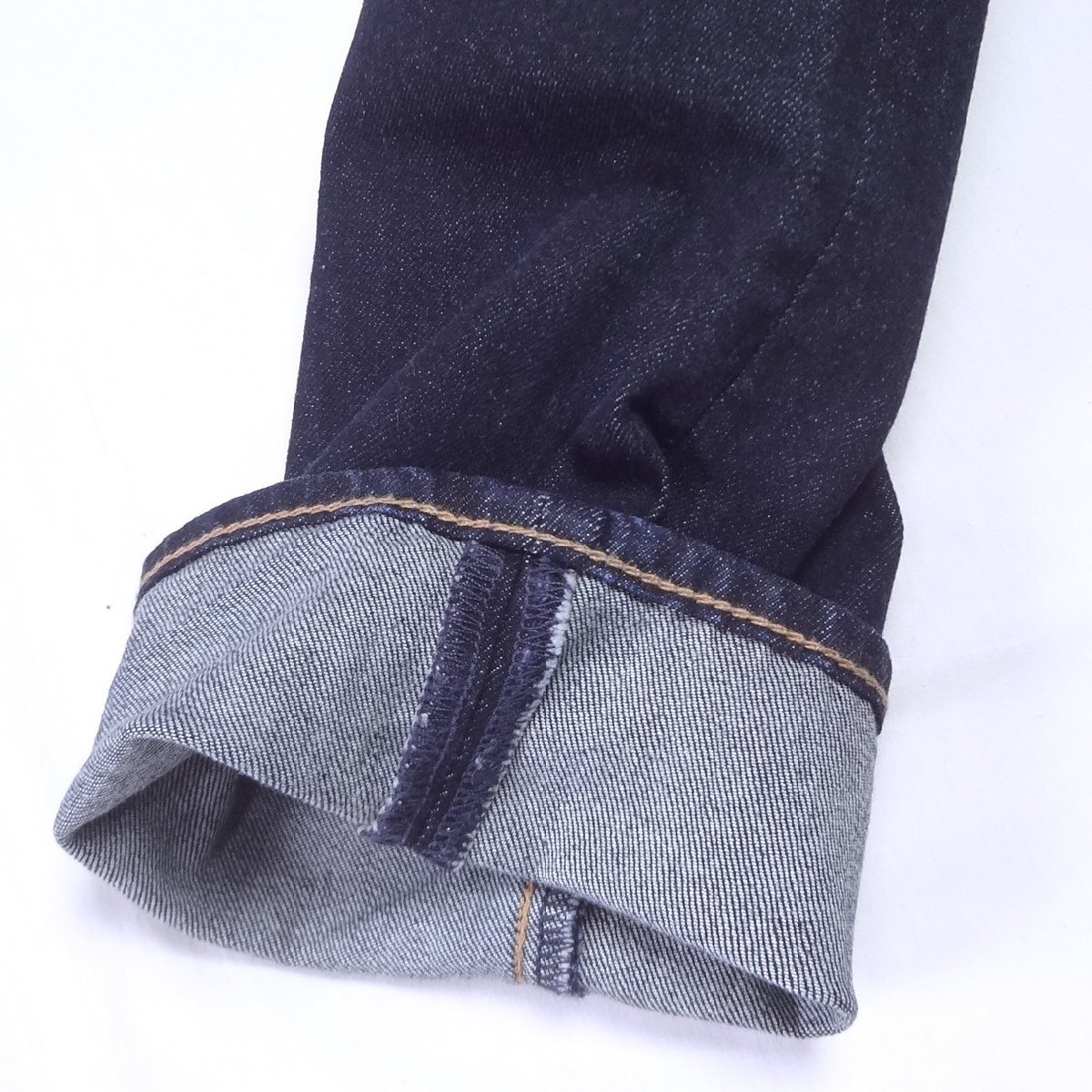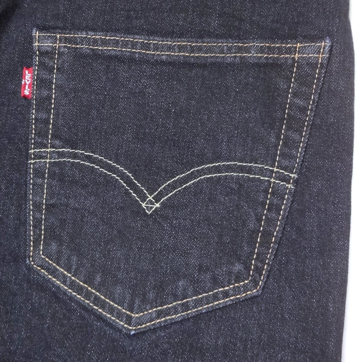 ・ビックEレッドタブ、フロントジッパー、アーキュエットステッチ、5ポケットリベット、レザーパッチ
