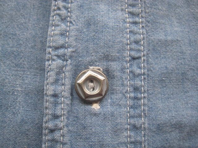 THE Y.M.WALK ONのチンスト・山ポケット付き インディゴデニムワークシャツです。首元はにチンスト付き、メタルボタン採用、マチ部分は空環仕上げになっています。