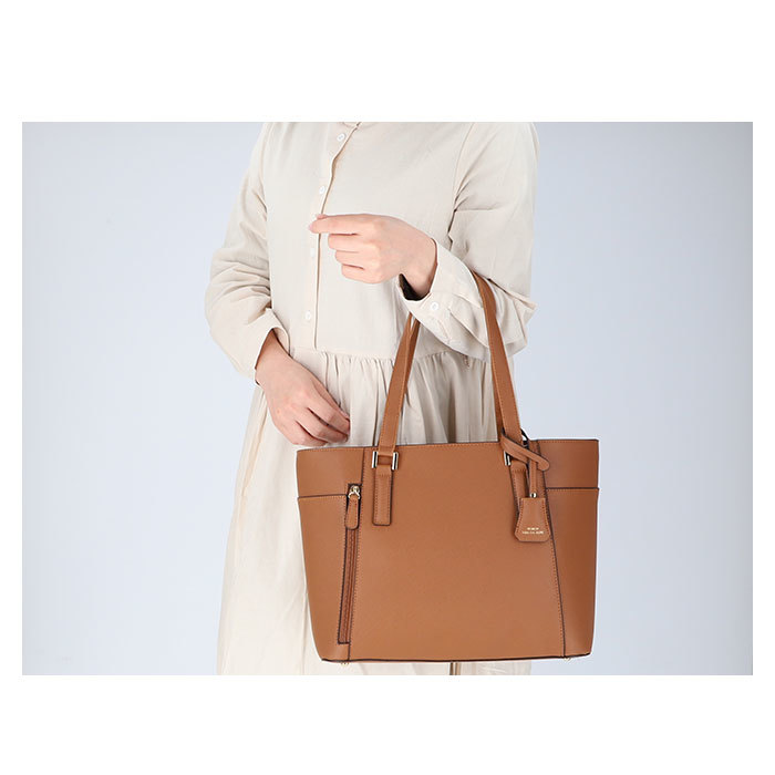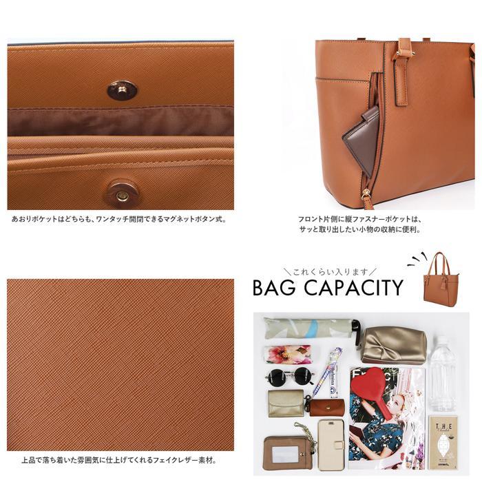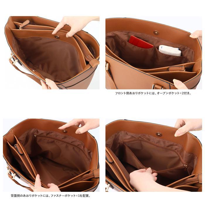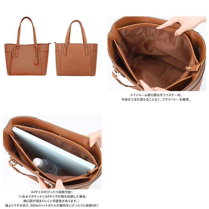 商品説明 | ・・ビジネスにもカジュアルにも使える!両あおりポケット付きのA4合皮トートが登場。 ・A4サイズがぴったり収納可能!通勤・通学に最適なトートバッグ。(※あおりポケットにA4サイズの物を収納した場合、開口部が閉まりにくい可能性があります。) ・メインルーム開口部は天ファスナー式。中身がこぼれ落ちることなく、プライバシーを確保。 ・内側は程よくマチがあり、500mlペットボトルが縦向きにぴったりと収納OK!長財布やコスメポーチなどもラクラクIN。 ・あおりポケットはどちらも、ワンタッチ開閉できるマグネットボタン式。 ・フロント側あおりポケットには、オープンポケット×2付き。 ・背面側のあおりポケットには、ファスナーポケット×1を配置。 ・フロント片側に縦ファスナーポケットは、サッと取り出したい小物の収納に便利。 ・持ち手が長めなので肩掛けがしやすく、持ち運びもスマート♪ ・上品で落ち着いた雰囲気に仕上げてくれるフェイクレザー素材。持つ人を選ばないシンプルなデザイン◎ ・取り外し可能なチャームがアクセント。 |