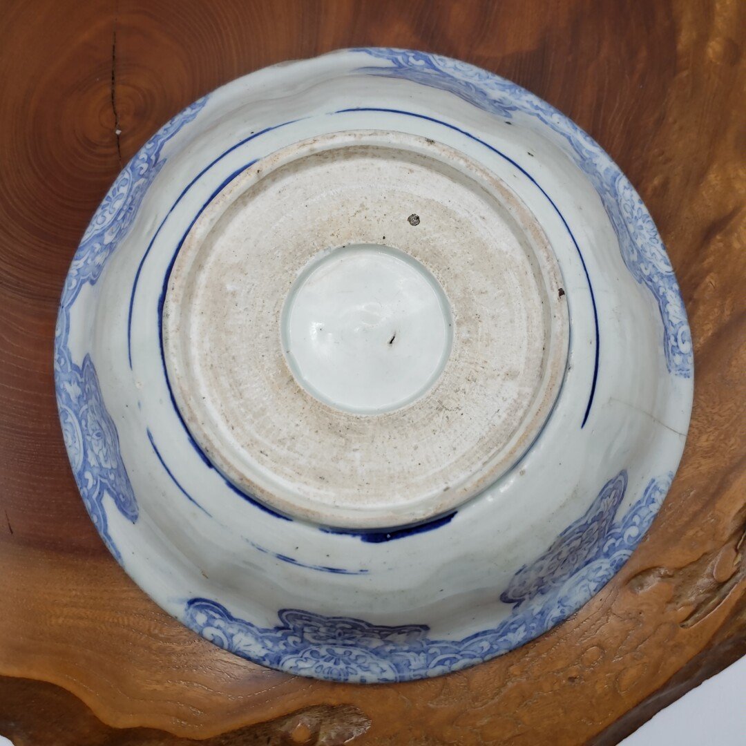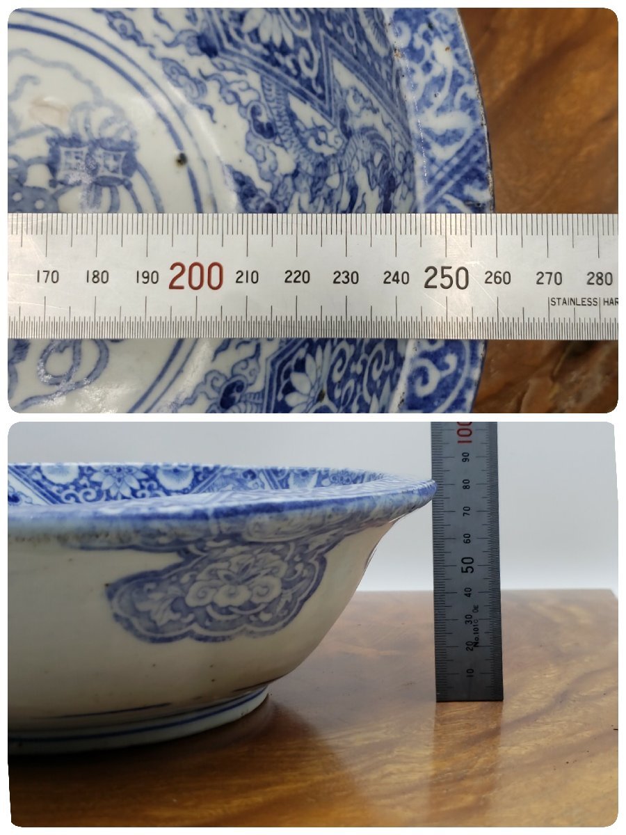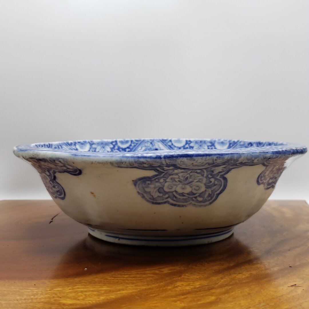年季の入った古伊万里?の銅板転写の大鉢です。 | 転写が重複している絵柄や欠け、汚れがありますがヒビ割れ、水漏れは無いのでいろいろな用途でご使用いただけると思います。 発送サイズ |