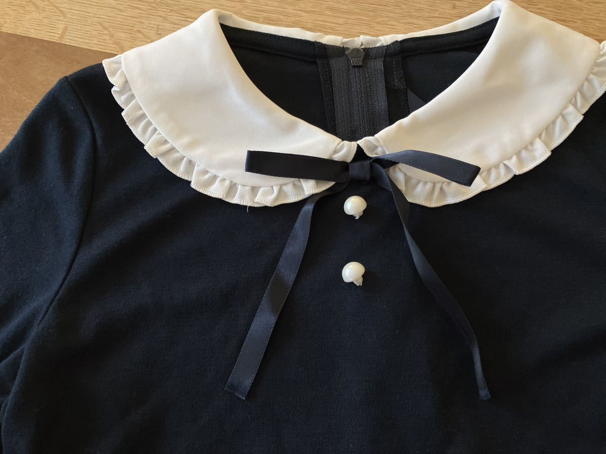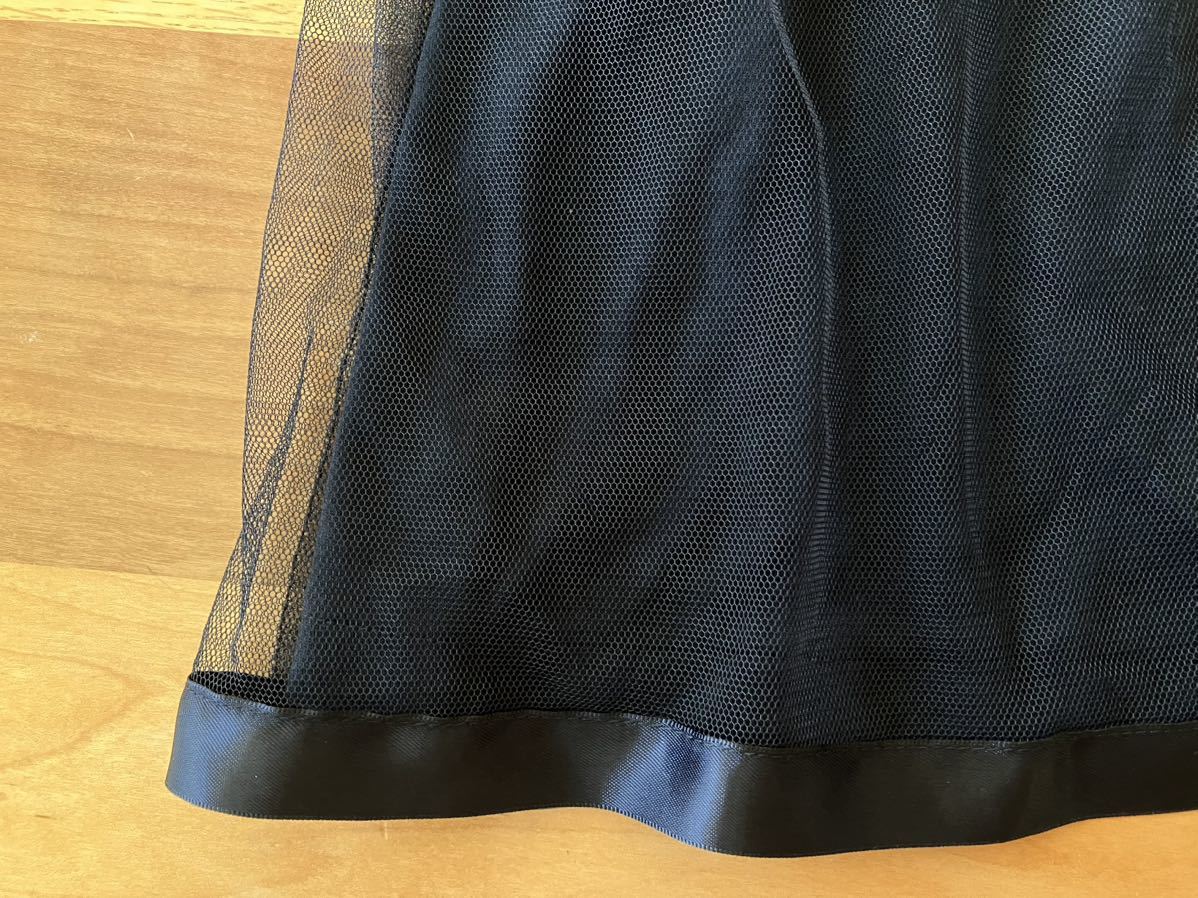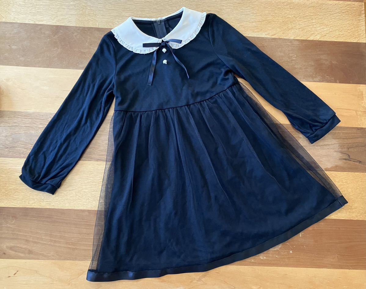 08-A606★送料無料・新品タグ付!フォーマルOK♪チュールスカートワンピース・ネイビー120・冠婚葬祭・リボン付・濃紺・長袖・白衿