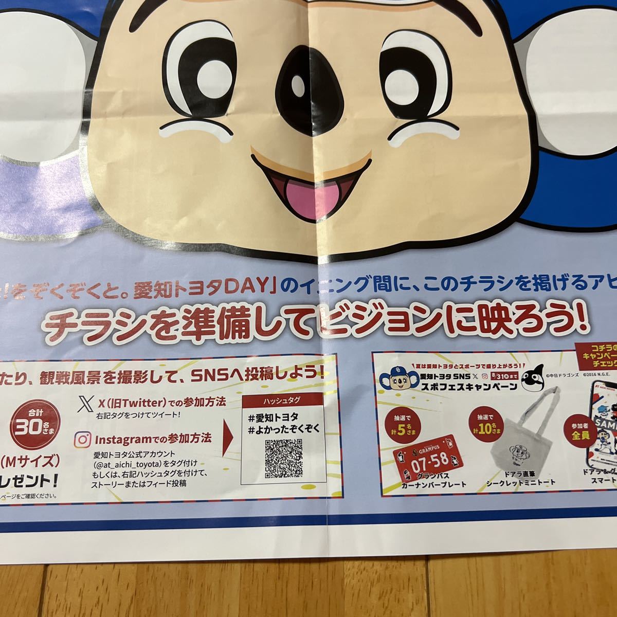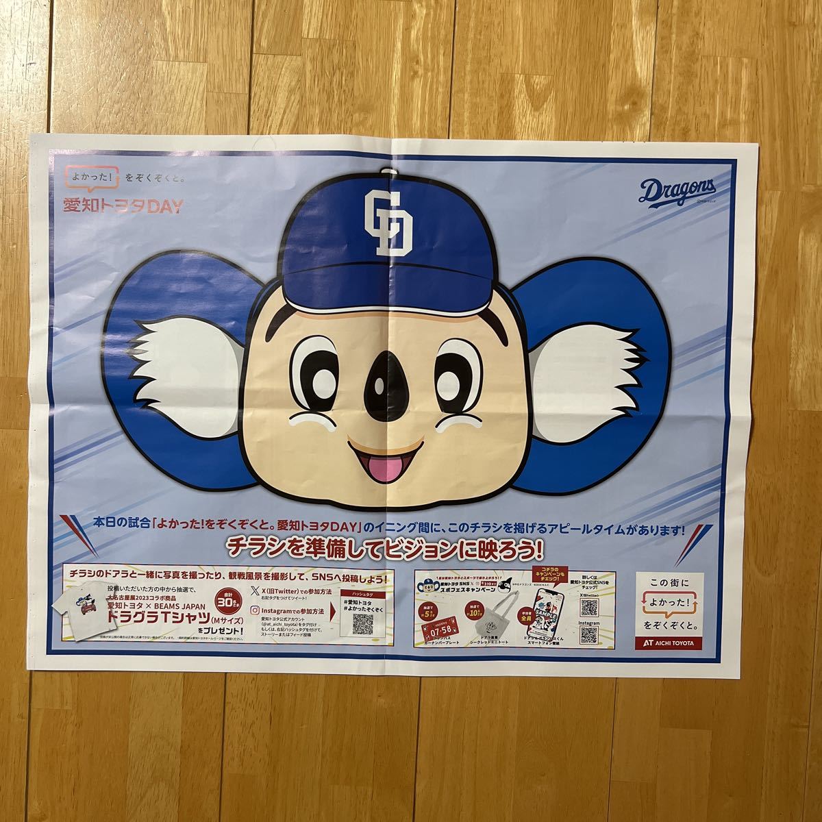 チラシ 8月26日 中日ドラゴンズVS横浜DeNA 愛知トヨタDAY ドアラ 送料無料の出品です。 (自己紹介一読し落札願います。) 発送時は、商品を折りたたんで発送しますことをご了承下さい。 サイズ横55.7センチ縦40.7センチ