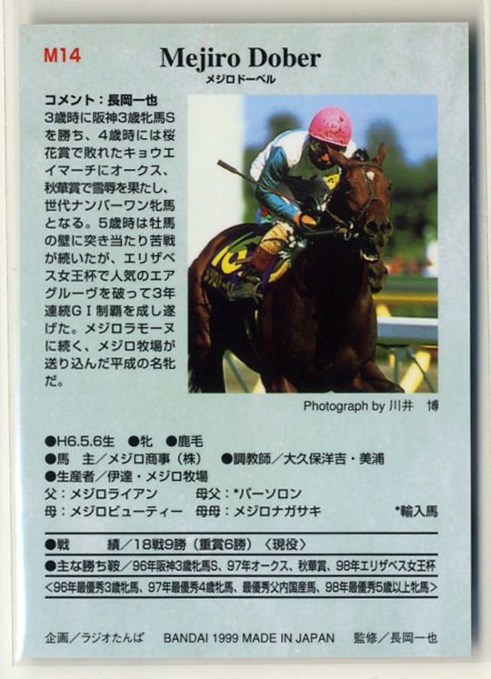 | ★メジロドーベル M14 メモリアルカード 銀文字箔押し バンダイ サラブレッドカード 98年下半期版 吉田豊 阪神3歳牝馬S オークス 秋華賞 エリザベス女王杯(2連覇) 写真 画像 競馬カード 即決 | |