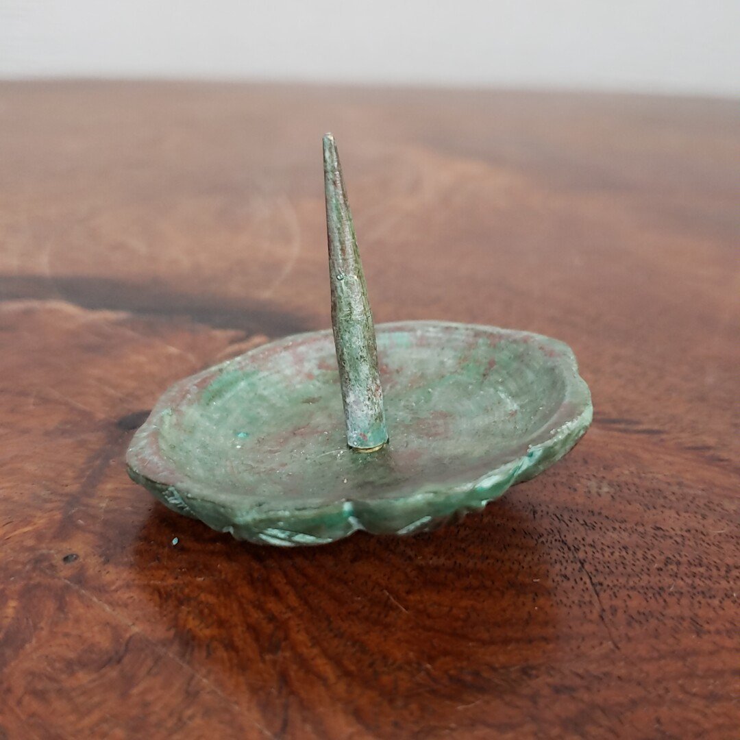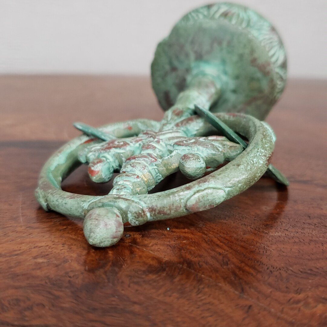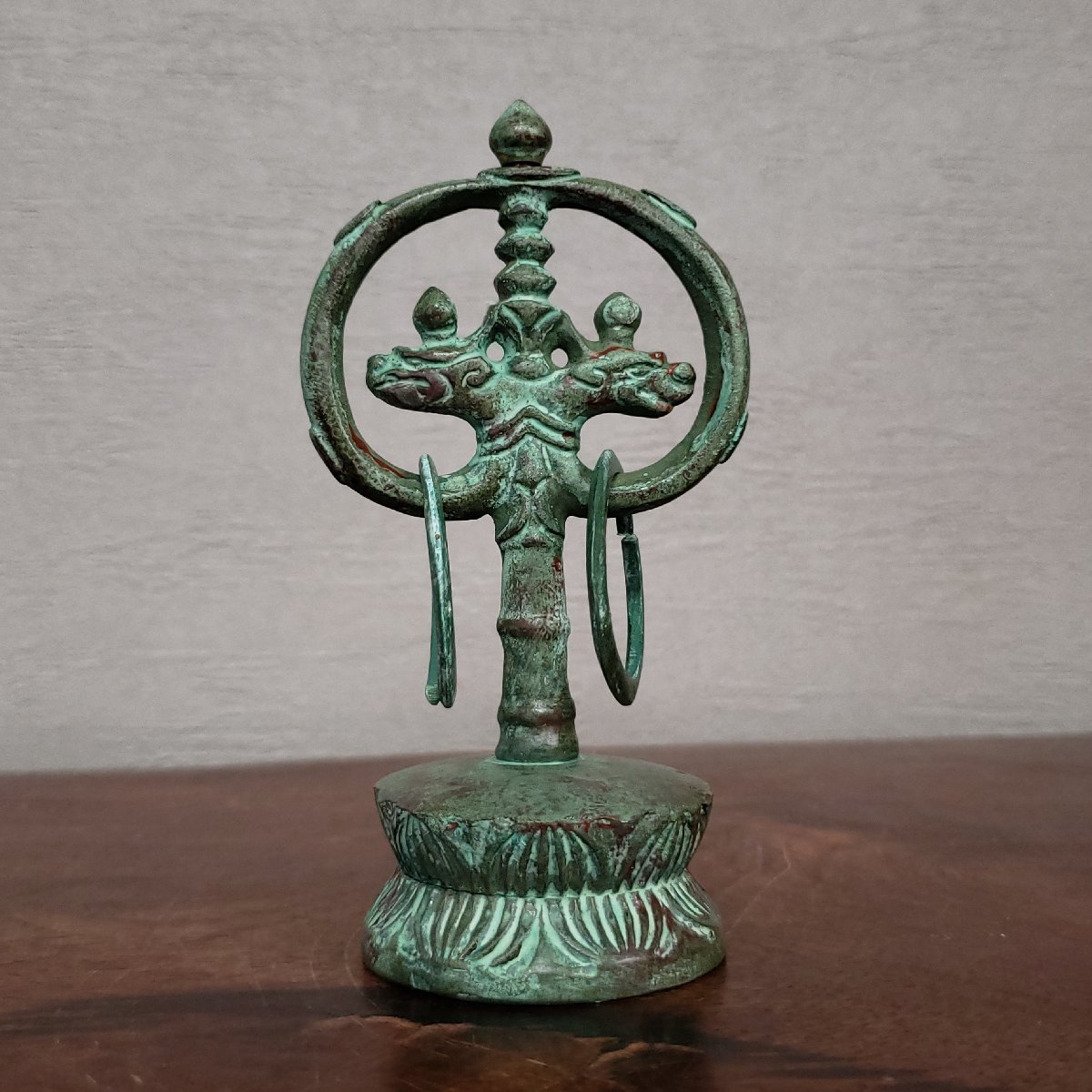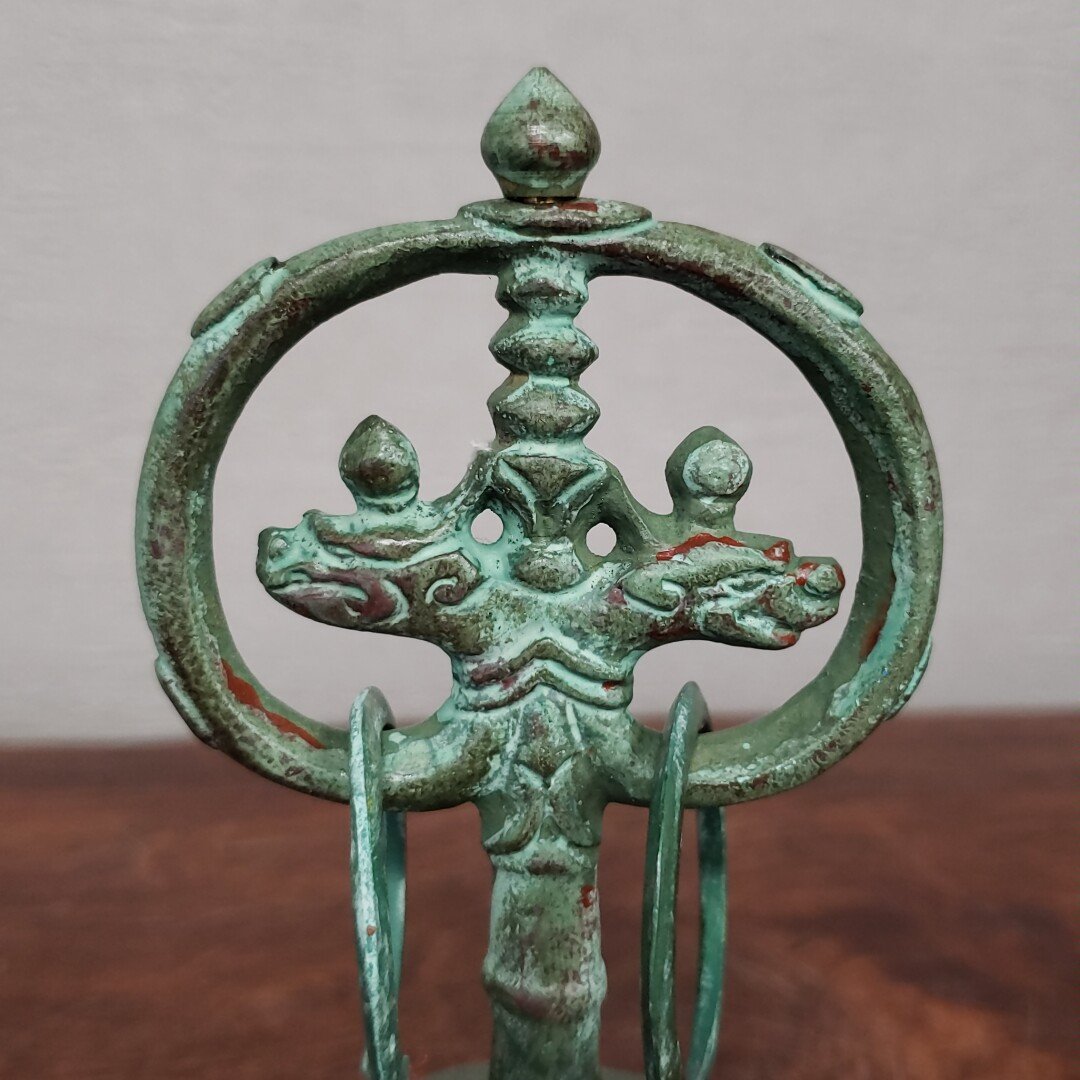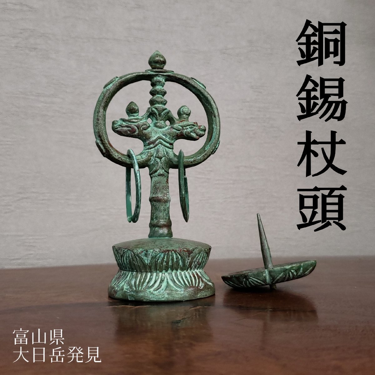 明治26年(1893)に立山の大日岳で発見された銅錫杖頭(双竜飾)のミニサイズの置物です。 | 本体と蝋燭置き?のようなものが付属しています。共箱はございません。 金属製のため、くすみ汚れ等はご容赦ください。 発送サイズ |