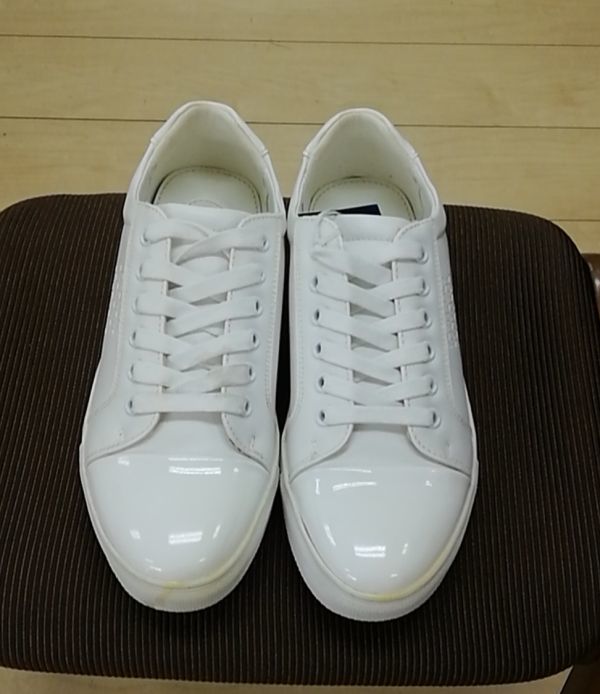 つま先とかかとに存在感あるエナメル材を使用、サイドにエンボス加工を施すことでトレンド感がアップ。