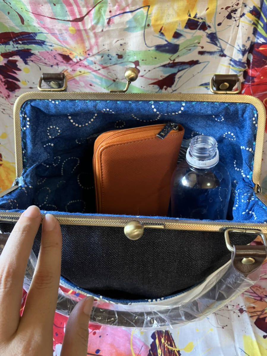 大きめの口金で、長財布や水筒など大きなものを入れることができます。