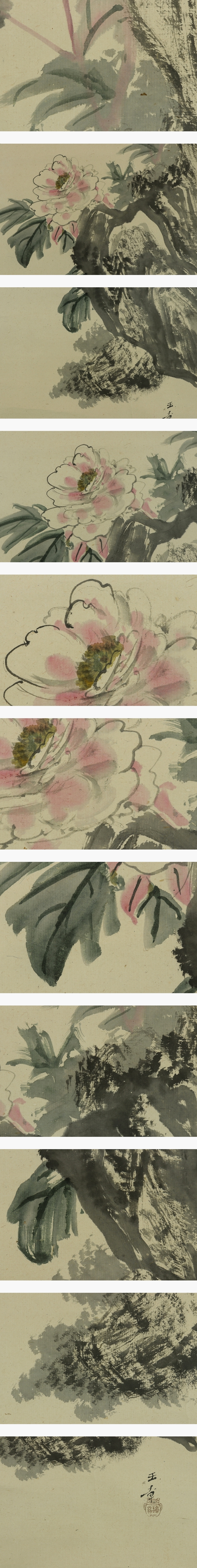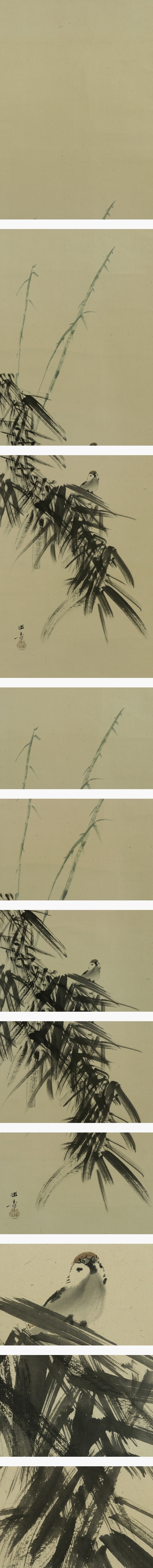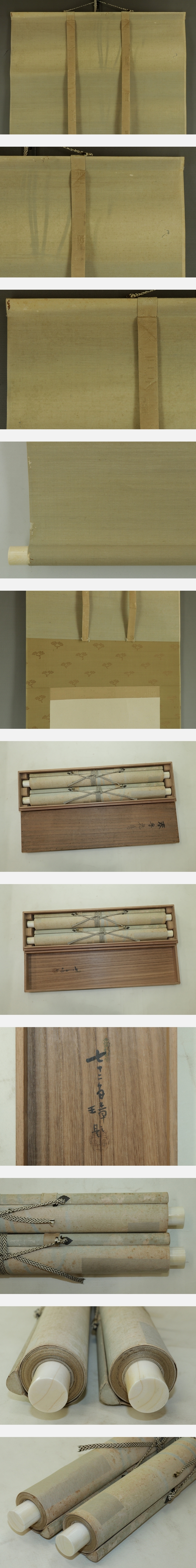 川端玉章 かわばた-ぎょくしょう(1842-1913) 日本画家。京都生。名は滝之助、別号に敬亭、晩年に璋翁。 11才の時中島来章の門に入り、のち小田海僊に学ぶ。 上京して高橋由一・ワーグマンに油絵も習う。 また円山応挙を慕い近代円山派の泰斗となる。 画塾天真堂・川端画学校を設立、門下に結城素明・平福百穂らを輩出する。 東美校教授・文展審査員・帝室技芸員。大正2年(1913)歿、72才。 本紙は、染み、汚れ、強い折れ、皺があります。 表装は、染み、汚れ、折れ、皺、くすみ、虫食い、破れ、ヤケ、修理痕、軸先にヒビがあります。 【サイズ】 作品 横約30.5cm×縦約120cm 表装 横約43cm×縦約204cm |