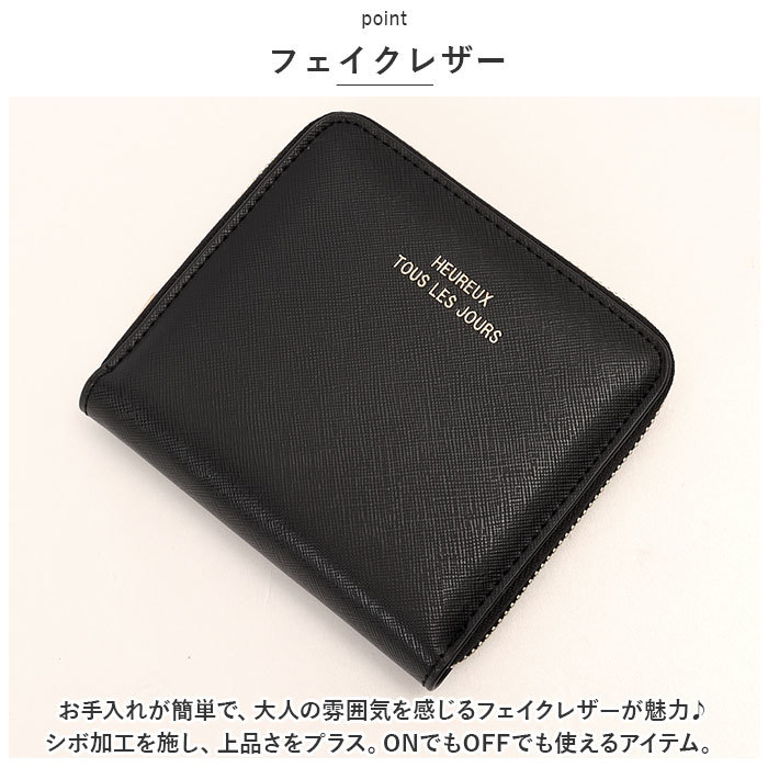 商品説明 | ・・シボ加工されたフェイクレザーが上品で大人っぽい♪「二つ折り財布」が登場。 ・【フェイクレザー】 ・お手入れが簡単で、大人の雰囲気を感じるフェイクレザーが魅力♪シボ加工を施し、上品さをプラス。ONでもOFFでも使えるアイテム。 ・【ラウンドファスナー】 ・ラウンドファスナー仕様なので、たっぷり収納だけどすっきりした見た目に◎中身が飛び出さないので安心。 ・【ガバっと開く】 ・ファスナーがガバっと開くので、財布全体が見えて必要な物を取り出しやすい!カードもコインもお札もパっと取り出せる。 ・【コイン収納】 ・コインルームはスナップボタンでパチッと留めるだけの、簡単収納。使いやすさにこだわったアイテム。 ・【ゴールド仕上げ】 ・金属部分とロゴはゴールド仕上げで、より高見え&大人っぽい印象に。落ち着きのある絶妙なレザーカラーも人気の秘密。 ・【ギフトに】 ・シンプルかつおしゃれなので、ギフトにぴったり。幅広い年齢の方が愛用できるウォレット☆ ・【ポケット仕様】 ・カードポケット×5 ・コインルーム×1 ・お札ルーム×1 |