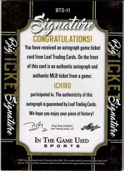 | ☆ MLB イチロー 22 Leaf In The Game Big Ticket 直筆サインカード ☆ | |