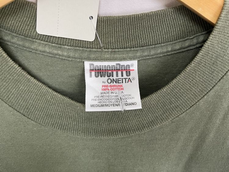 グッドプリントUSA製90sビンテージPowerpro ONEITAオニータボディ半袖クルーネックプリントTシャツMカーキ100綿アメカジストリートnr24027