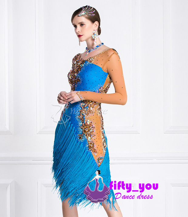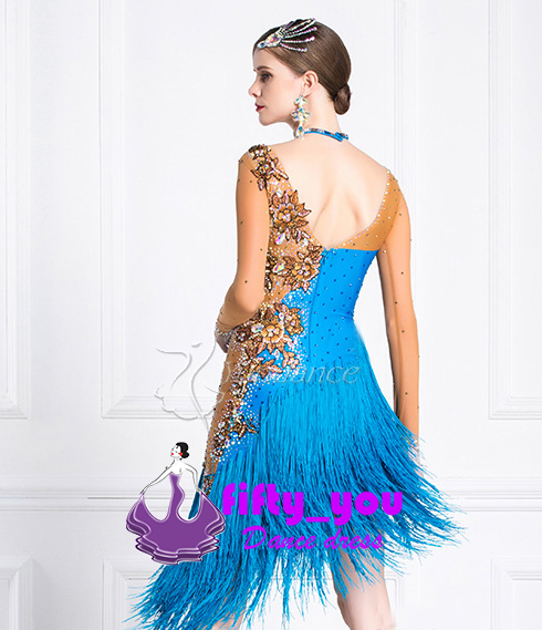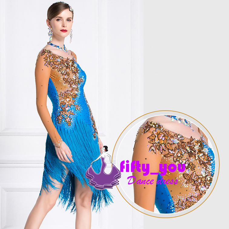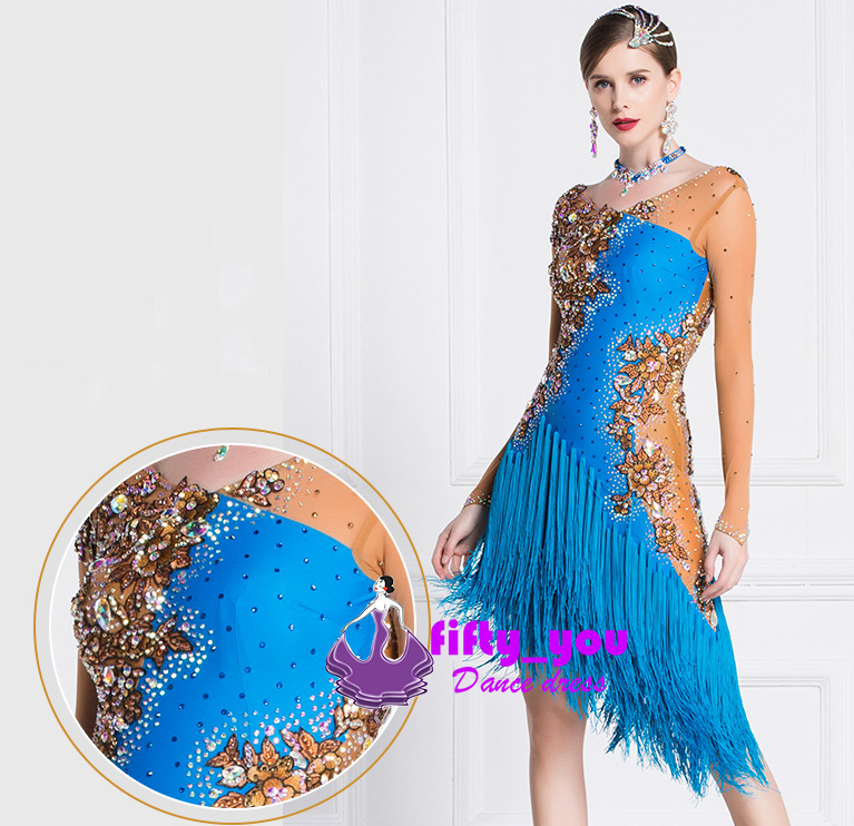 新品fifty_you高級品 レディース社交ダンスラテンドレス 競技試合注目新作ダンスドレス ゴージャス花柄付 新作 セミオーダー フリンジ飾り