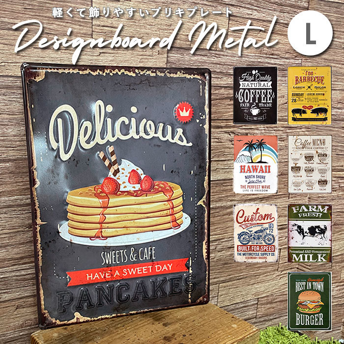 商品説明 | ・軽くて飾りやすいブリキプレート「デザインボードメタル L」が新発売。 ・壁に立てかけるだけで、お部屋がアメリカンガレージのような雰囲気に! ・紐やビスを通せる穴が四隅に開いているので、壁に掛けて飾ることも可能。 ・素材はスチール製。エイジングを施したプリントは、ビンテージ感ばっちり♪(※性質上、特徴として汚れや反りなどが見られます。予めご了承ください。) ・古き良き時代を感じられるムードたっぷりのアイテム。何枚でも欲しくなっちゃう♪ |