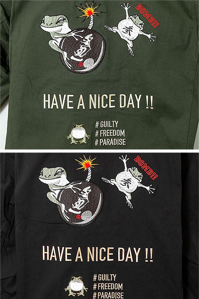 「参丸一」さんから「蛙爆破ミリタリー」総刺繍ジャケット(SM-30611)のご紹介です。 爆弾で遊ぶワイルドな蛙たち。 そんな元気な蛙たちから「HAVE A NICE DAY!!( 良い一日を!)」というメッセージが送られています。 膨れ蛙は爆弾のモノマネでしょうか? ボディーにはしっかりとした綿とポリウレタンの混紡素材を採用。 フロントはスナップボタン仕様です。 両胸、身頃にはそれぞれ大きめのポケットを縫い付けました。 | ||||||||||||||||||||