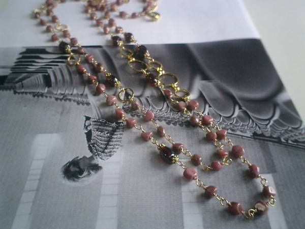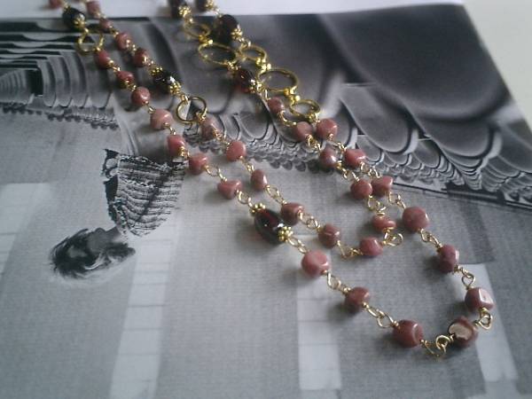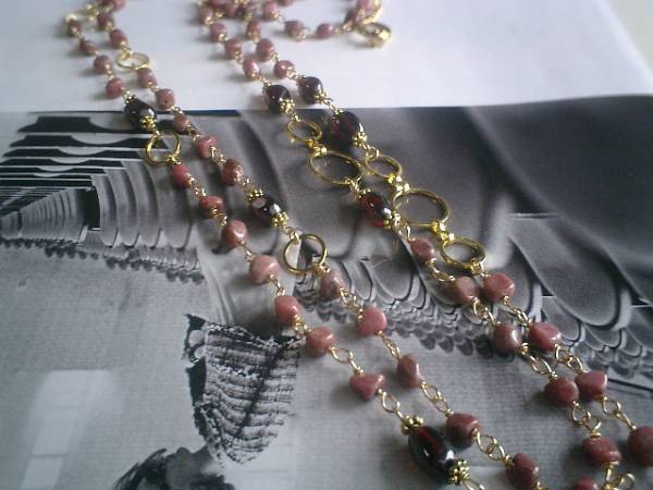 ジャンヌの幸せ・・シリーズです♪お気に入りのピンクと赤・・シックなロードナイトのネックレス2本セットです♪同じデザインの長さ違いのネックレス2本セットです♪重ねてネックレスに、1本をブレスレットにと色々な組み合わせで楽しんでいただけます♪深い赤のガーネットを合わせて大人のロマンチックしています♪ロードナイトは6ミリ位のミニ・タンブル、ガーネットは10×8ミリ位のオーバルです♪長さは長い方のネックレスは全長102センチ位で調節自由です♪2連にされても素敵です♪短い方のネックレスは全長80センチ位です♪ブレスレットにされても素敵です♪それぞれ単品やブレスレットも出品しています♪シンプルで合わせやすいデザインを考えて作りました♪♪ハンドメイドをご理解頂いてノークレーム、ノーリターンでお願いします