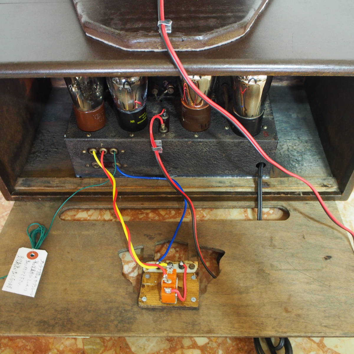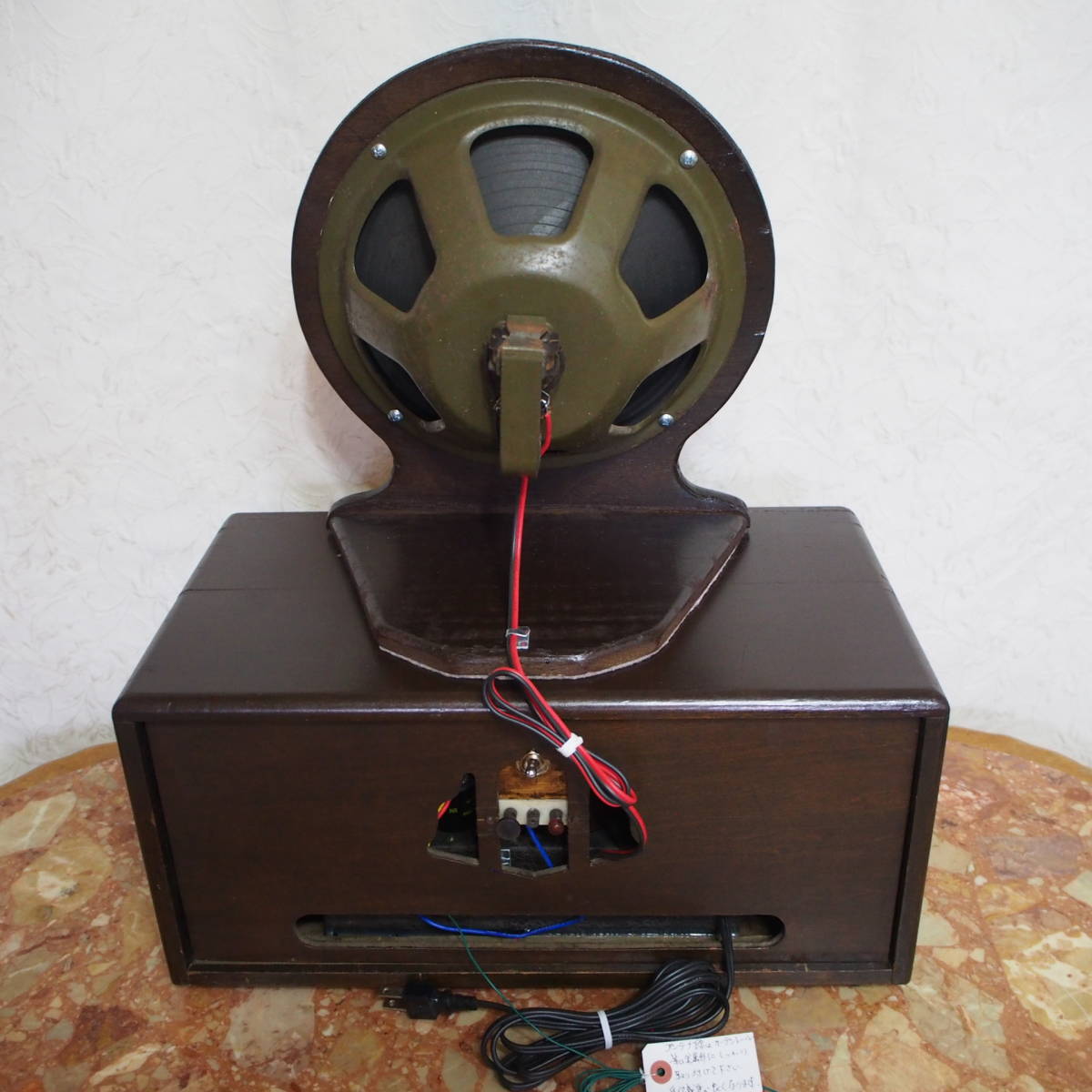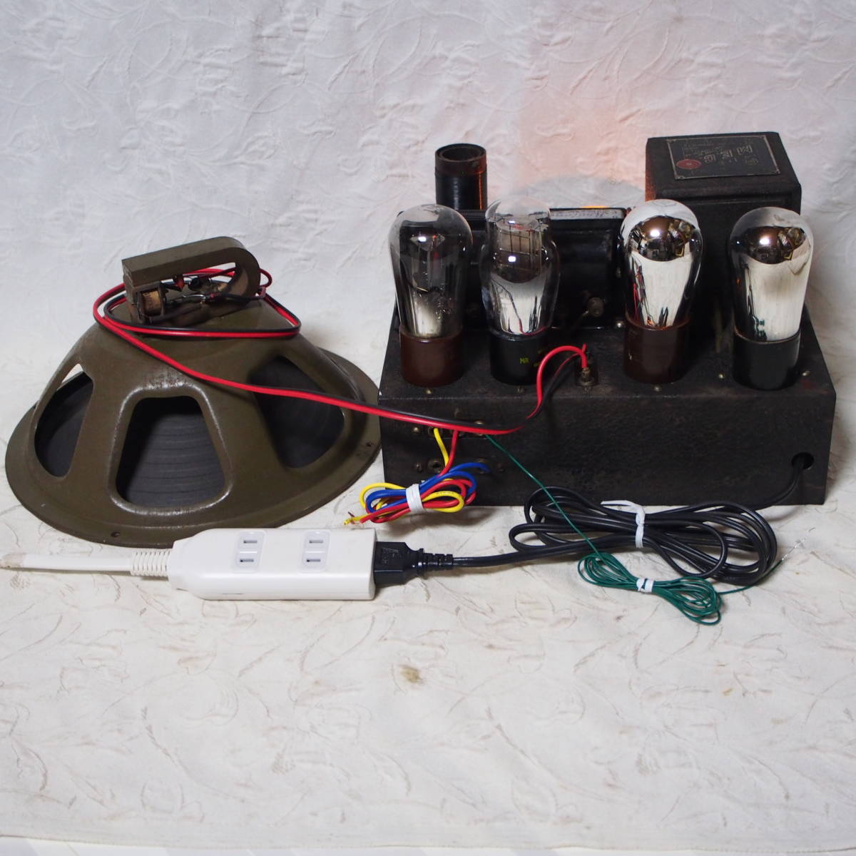 商品説明 ・・・   整備済み完動品、メーカー不明で スピーカーの外装を自作とし ナス型 & 大型ST真空管を使用したビンテージなラジオです。当方に於きましては 商品に再度の命を与えるべく入手当初のままの状態でレストア復元 ( 電気的外科手術 ) を施し 商品の新たなる社会復帰を願ってオークション出品とした次第です。 その様な事で、当商品の出品に対してご理解とご了承の程を宜しくお願い致します ・・。 同系色のオイルステイン&ニス塗布により 木目を生かした外装ケースの程度の方は 多少なりの年代経過感と工作感が有る状態ですが、オリジナルな3個のダイアルツマミ等も有り 状態の良い機器と成っています。又、木製ケース下部の「4個のインスレーター ( ゴムブッシュ )」を取り付けとしています。使用真空管は「UY-56 / UX-26B ( 希少 大型ST管 ) / UX-12A / UX-12A ( 異種管を半波整流管としましたが、良好な動作を確認済みとしています ・・ )」のビンテージな真空管 合計4本と成っています。 ダイアル操作等の方は、フロント部の左から「電源スイッチ / メインバリコン用 / 再生バリコン用電源スイッチ」と成っています。又、今回 本機リア部に「ラジオ―PU 切り替えスイッチ と 外部入力端子」を新設としています ( モノラルサウンドですが CD・iPhone・等が聞く事が出来ます / 音量調節等は 付加機器側の対応でお願い致します ・・ )」。なお、今回の主なレストア作業に付いては、「安全を考慮して 電源コード・スピーカーコードの交換 / 低周波チョークコイルが断線していたので「3KΩ 3W型の抵抗器」を取り付け状態復帰 / 電解コンデンサーがNGだった為、空きスペースに「中継ラグ」を取り付け 「NEWな 22μF 250V ×3μF / 33μF 50V ×1」と交換して状態復帰 / 入手当初、2の「1:3 昇圧トランス」中 1個がNGな状態だったので 状態の良い同等品と交換して状態復帰 / 2~3か所のハンダ外れ・ハンダ浮き が有ったので、これらを再ハンダ付け / 受信感度は有るものの ブロードキャスト帯の受信が不能だったので、目視 & テスター点検で「アンテナコイル2次側アース線と昇圧トランスのアース結線とされるシャシーワッシャー」の取り付け不良が確認され、これをシッカリとシャシーアースして状態復帰 / 各 配線系をリニューアル化して状態復帰 / バリコン等の各周動部にオイルメンテナンスの実施 / 等々」として完動品とした次第です。 シャシー内部もクリーニング済みとした整備済み完動品、スピーカーの外装を自作とし ナス型 & 大型ST真空管を使用したビンテージなラジオでノスタルジックなサウンドを聞いて見ては如何でしょうか ・・・。 ちなみに大きさは  42,5cm / スピーカーを含む全高50,5cm ( 本機の高さ 20,5cm ) / 全奥行き 24cm、全重量 凡そ 7Kg と成っています。
