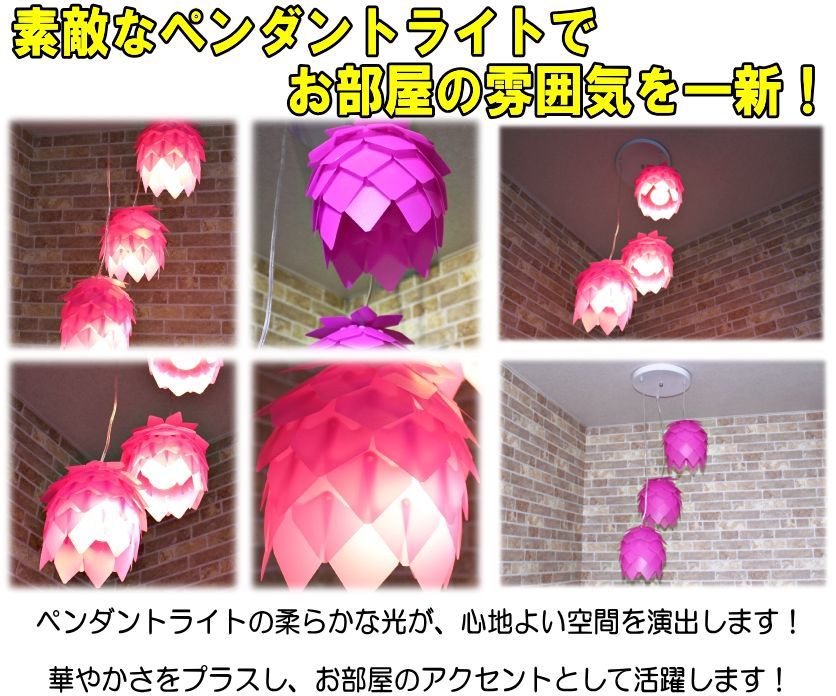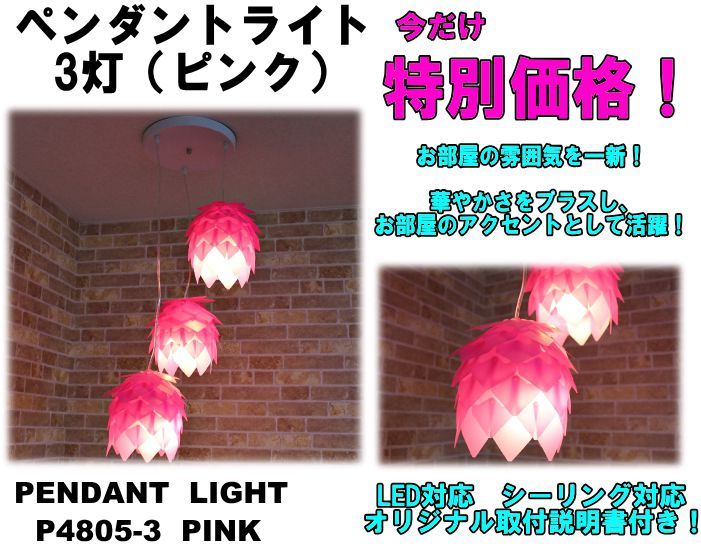 ◆在庫一掃セール お手軽な価格で、お部屋をより魅力的に演出! ◆素敵なペンダントライトでお部屋の雰囲気を一新しませんか? お部屋の雰囲気を変える新しいアイテムです! ◆ペンダントライトの柔らかな光が、心地よい空間を演出します! ◆華やかさをプラスし、お部屋のアクセントとして活躍します! ◆シーリングタイプで取付簡単! ◆商品の組み立てをして頂かなくてはいけませんが、 弊社オリジナル説明書をお付けしているので安心です♪ 【商品名】 ◆ペンダントライト 3灯 シーリングタイプ LED対応 ◆カラー : ピンク 【商品内容】 ・本体一式 ・E26 LED電球 × 3個 ・オリジナル簡易説明書 【商品サイズ】 ■□ ライト部分 □■ ・高さ:約18cm ・横:約19cm ・長さ:90cm(※長さ調節可能) ■□ 取付部分 □■ ・高さ:約2.5cm ・直径:約25cm ・全長:約90cm ・重量:約0.9kg ![]() |