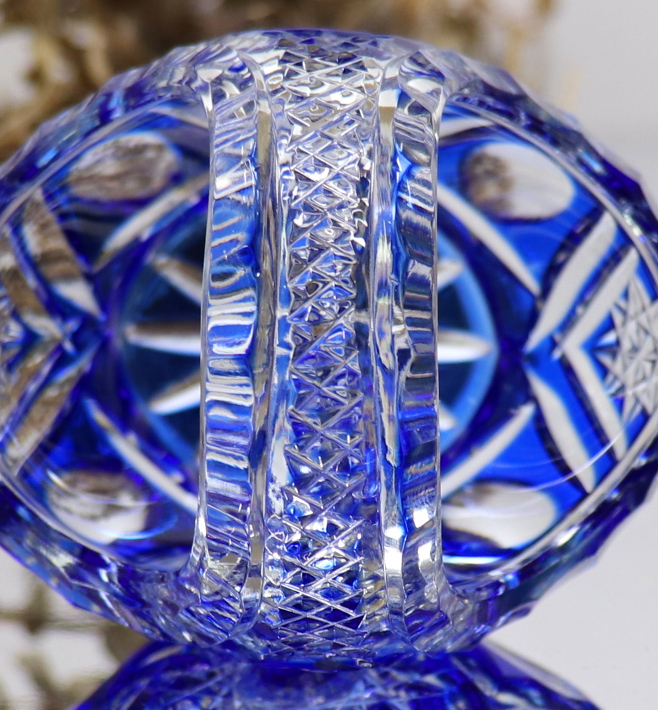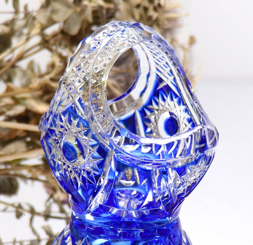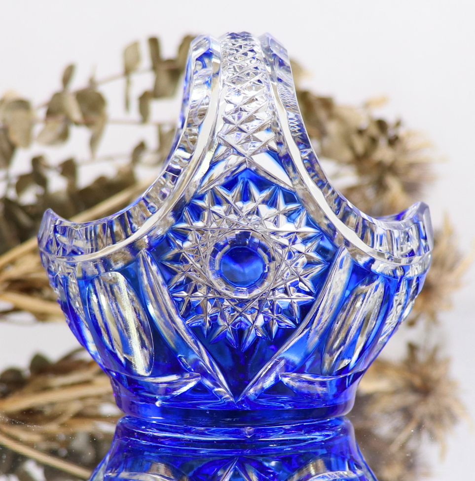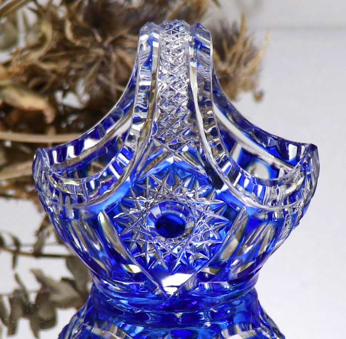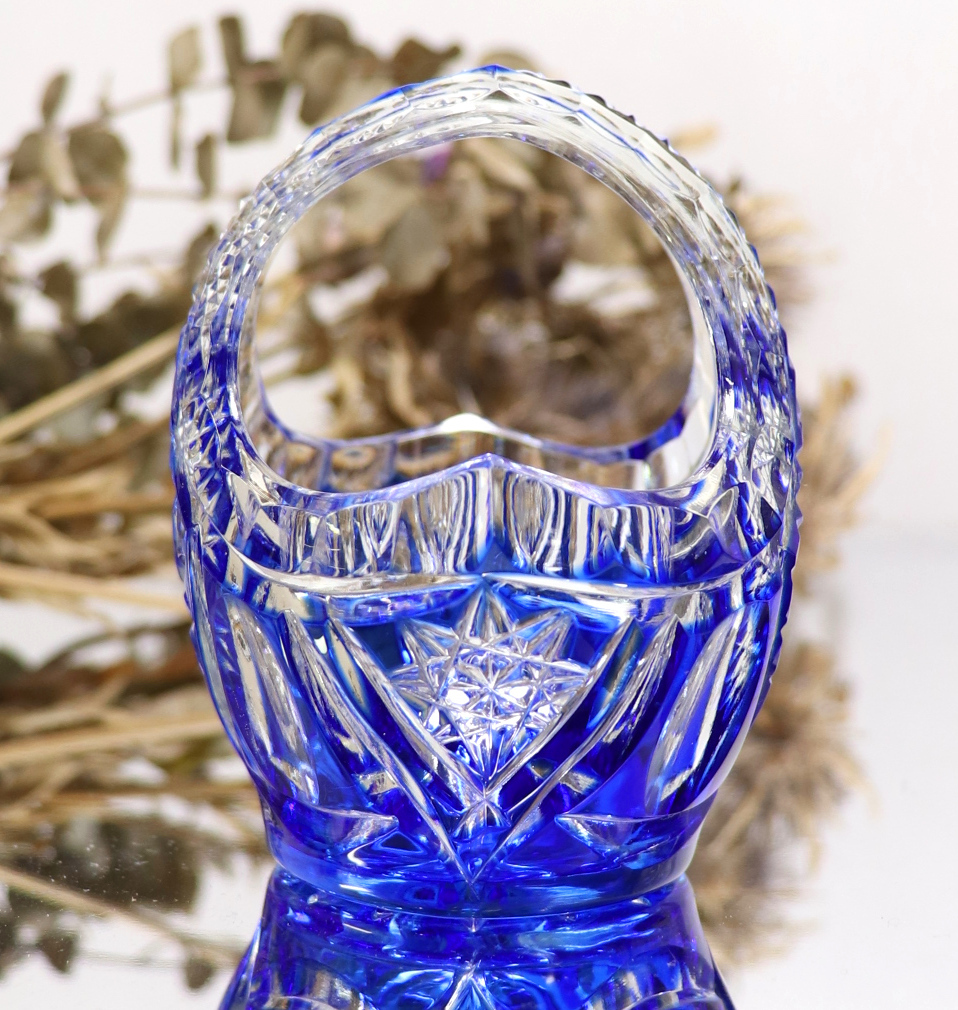 オールド・バカラ (BACCARAT) ディアマン・ピエーリー 青色被せ装飾 バスケット アンティーク 鉢 ボウル 小物入れ 切子 義山 花瓶 春海商店