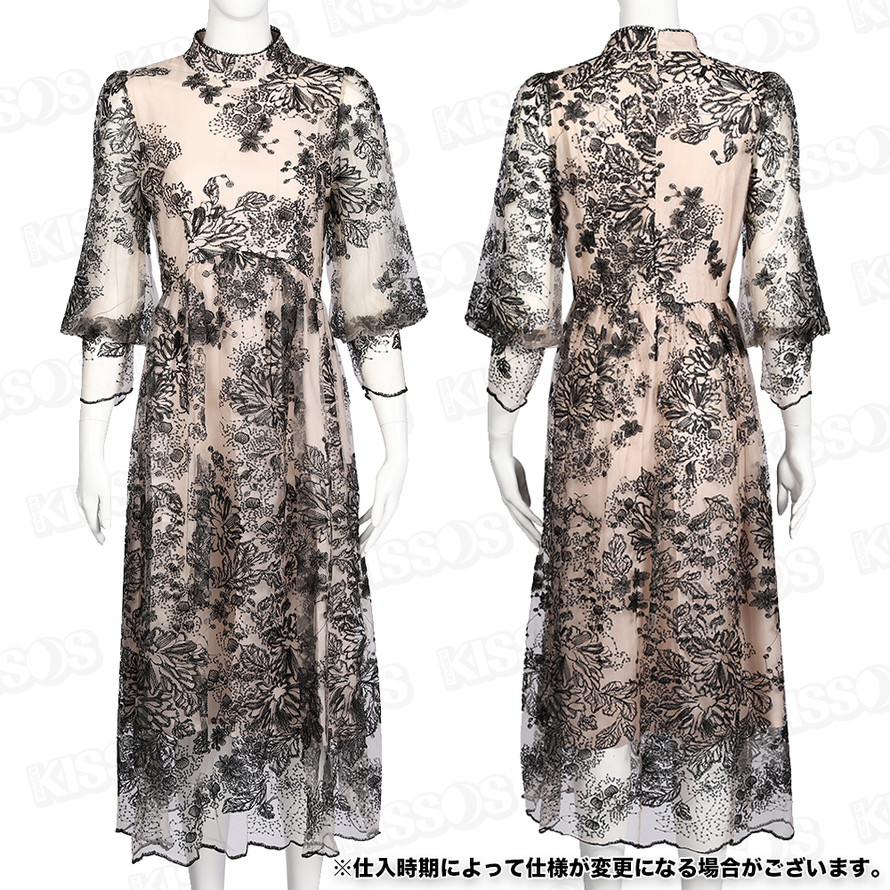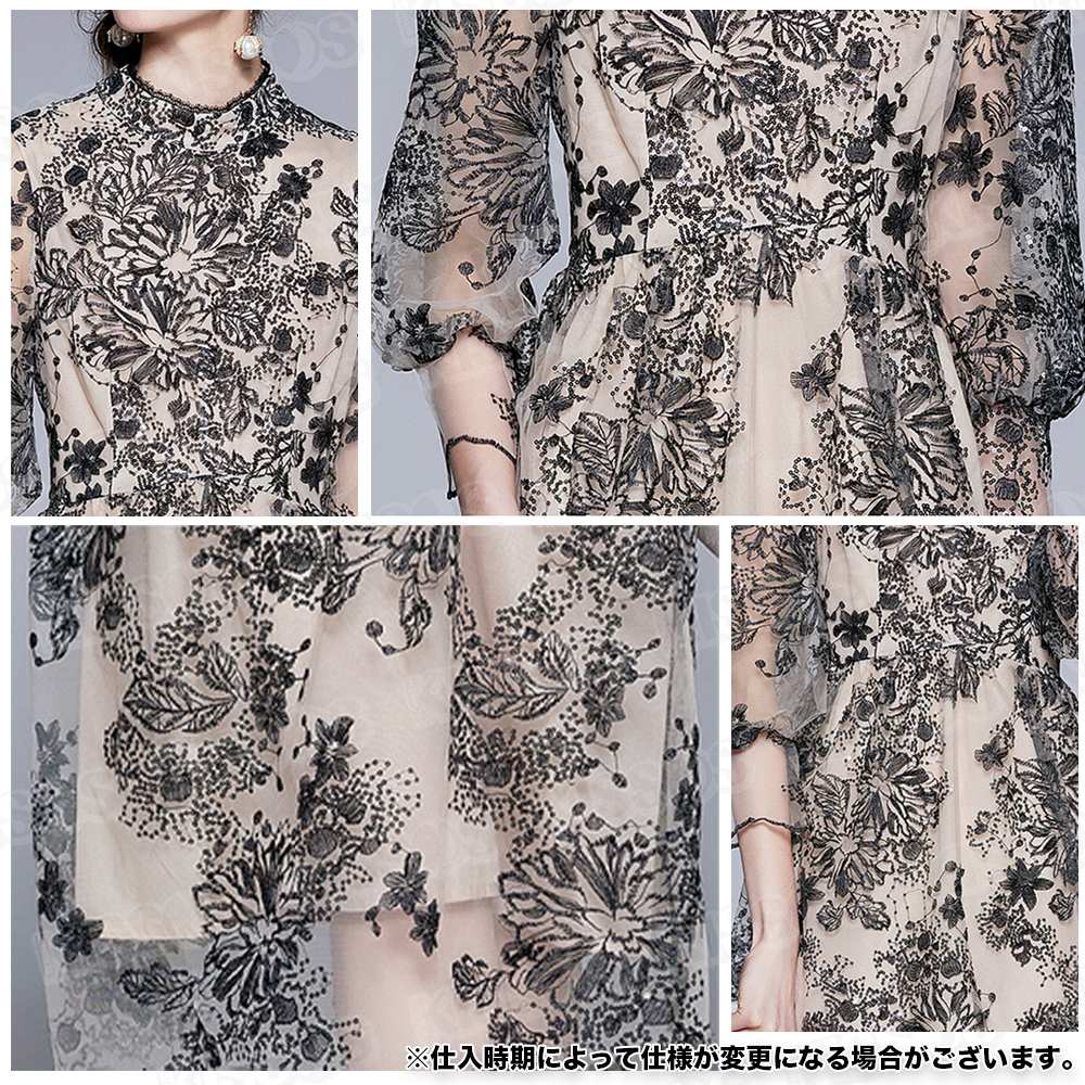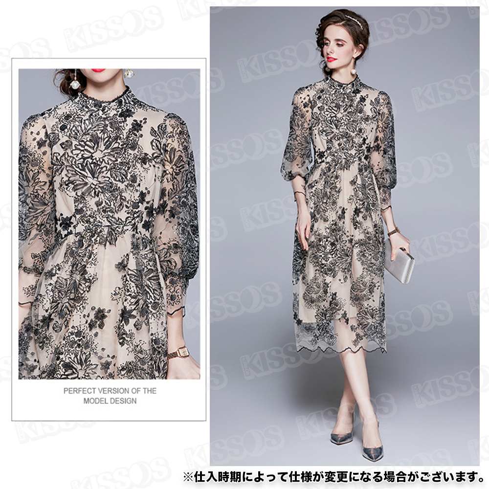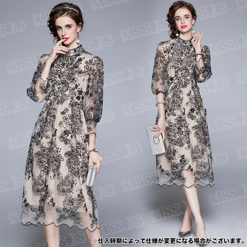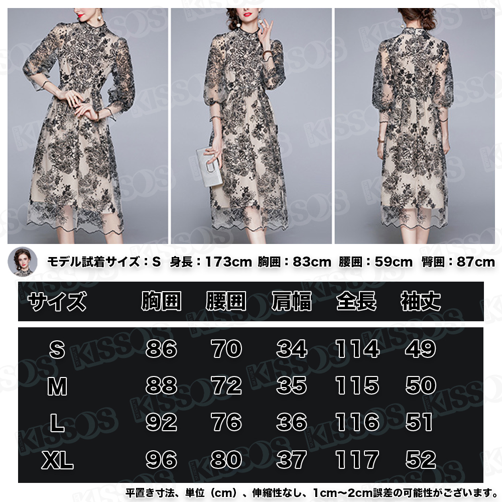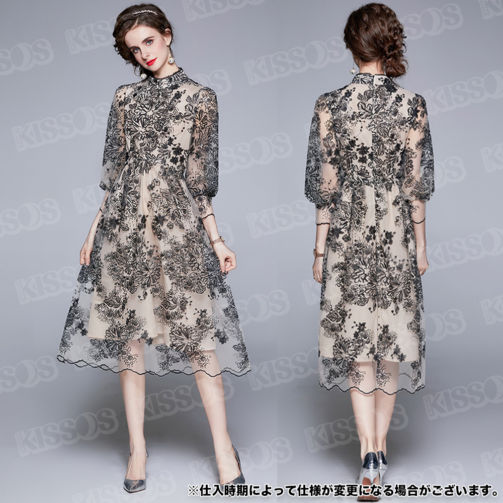 キッソス(KISSOS) レディース ワンピース ドレス レース 刺繍 七分袖 パーティー 結婚式 お呼ばれ ブラック (Lサイズ)