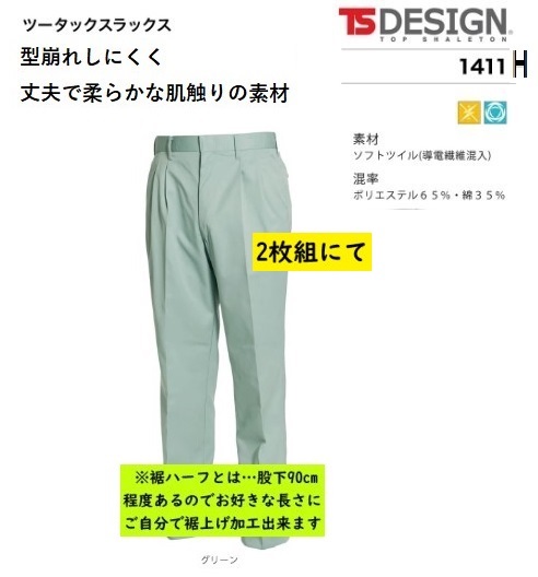 ビックイナバ特価◆TSDESIGN 1411H裾ハーフ[秋冬]スラックス【52グリーン・W82cm】ソフトツイル素材・定価1枚7700円の品、2枚即決2980円