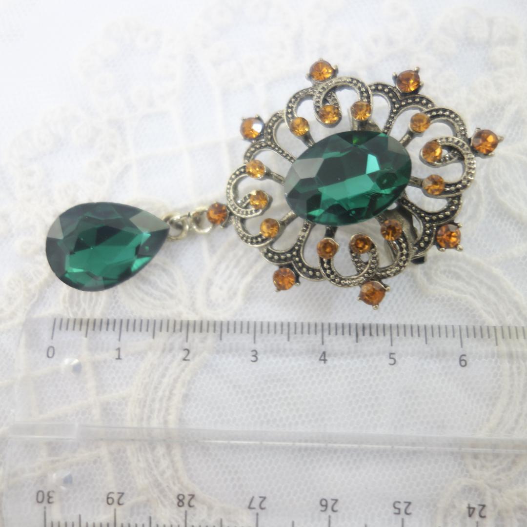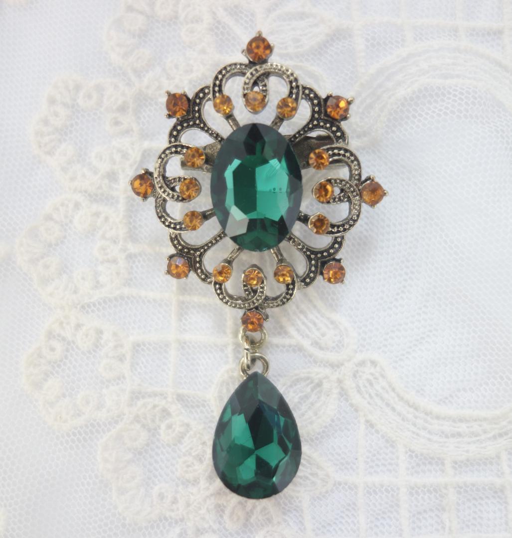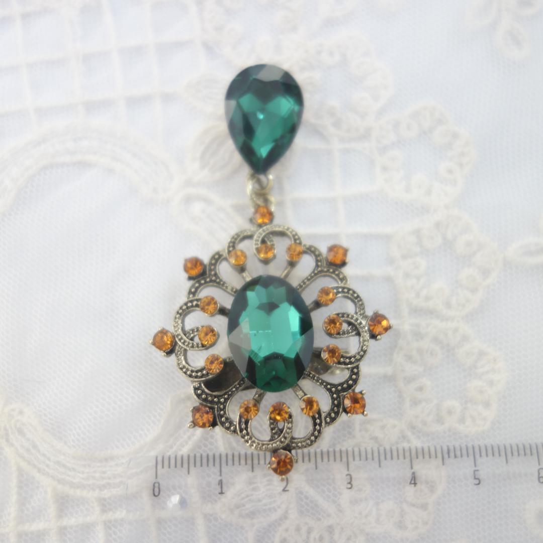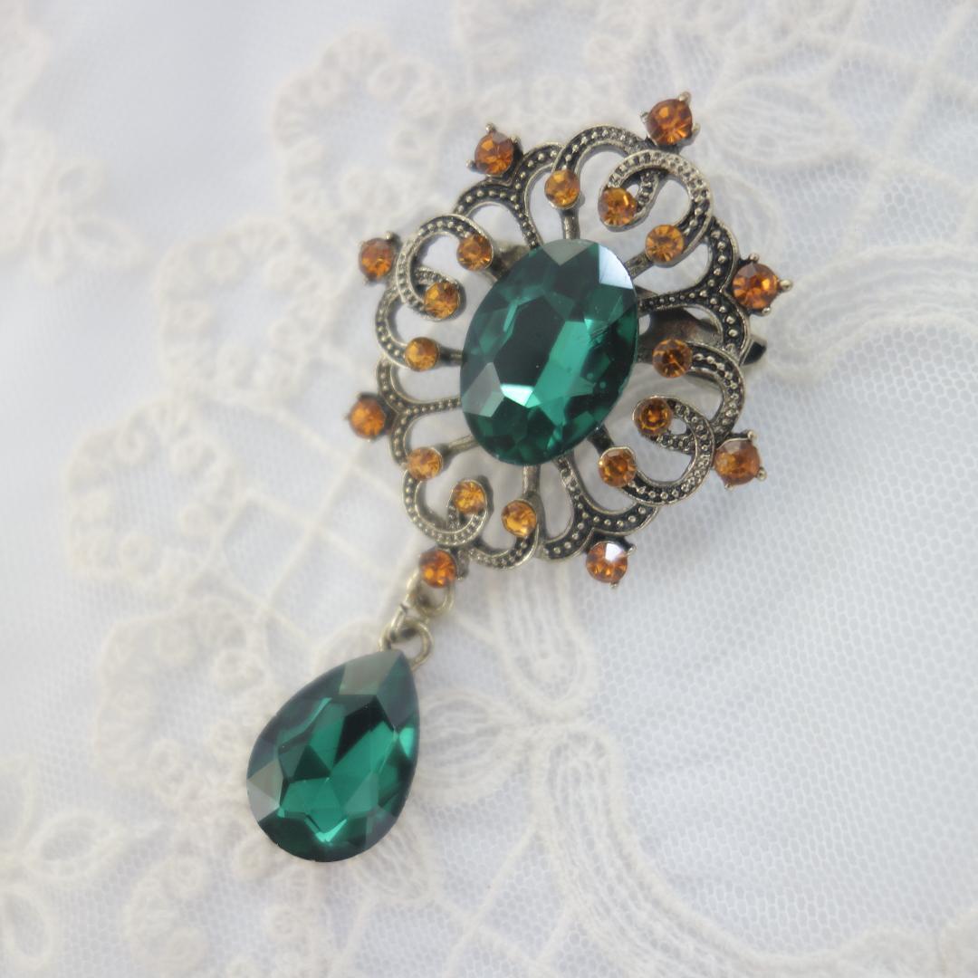 エメラルド色輝石&オレンジトパーズ色輝石 アンティーク調 雰囲気ある ブローチ